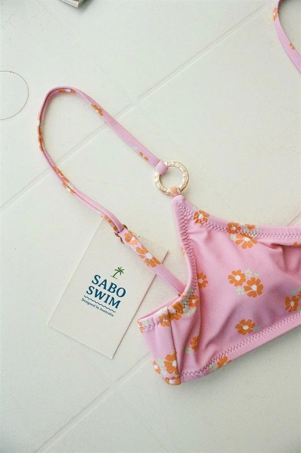 *THIS IS A FINAL SALE ITEM* The Oliana Scoop Bandeau has the perfect amount of coverage for beach babes, made from a stretchy pastel magenta fabric featuring our exclusive retro inspired floral print. It is a fixed, scoop bandeau style featuring a super flattering curved cut with adjustable straps and gold ring hardware detailing. Perfect paired with the Oliana Ring Bottom and Banks Sunglasses! Exclusively designed by Sabo.