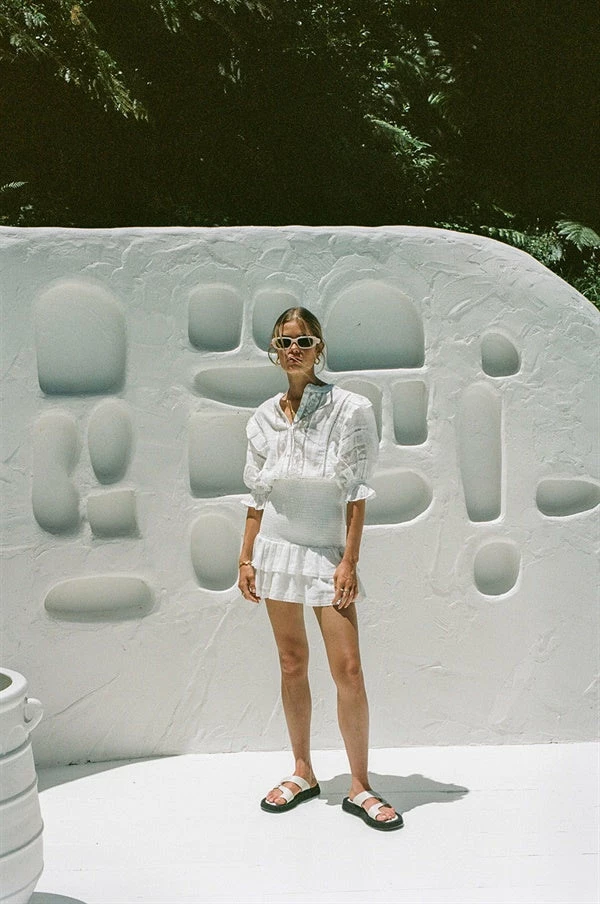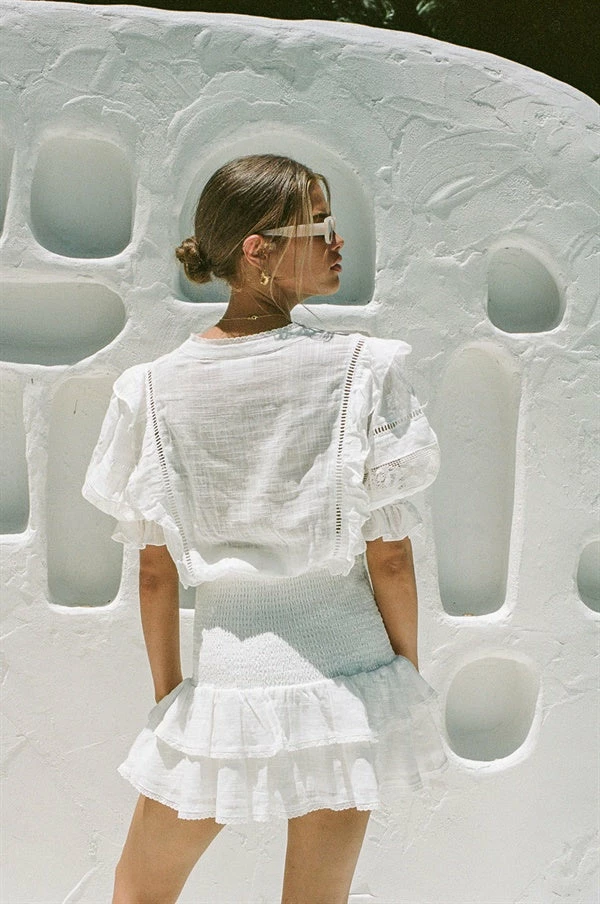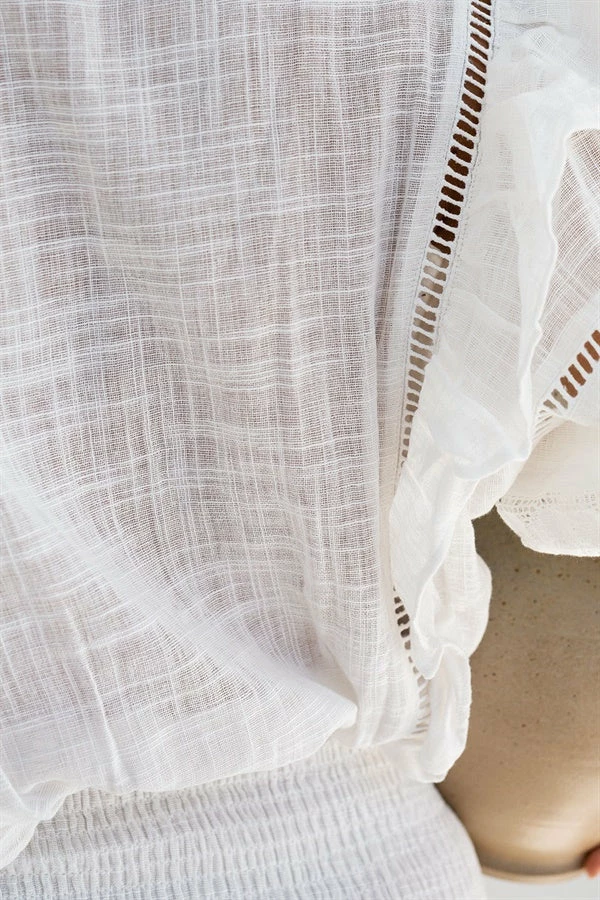 Dripping in feminine details! The Onnika Dress is made from a natural gauze cotton fabric in an off white hue. It features sheer and lace ladder panel detailing at bodice and sleeves, short puff sleeves, ruffle detailing at cuffs, bodice and skirt, shirred panel at waist and a flouncy double tiered hem. Style your look with the Strappy Tallara Heels and Rico Handle Bag! Designed exclusively by Sabo.