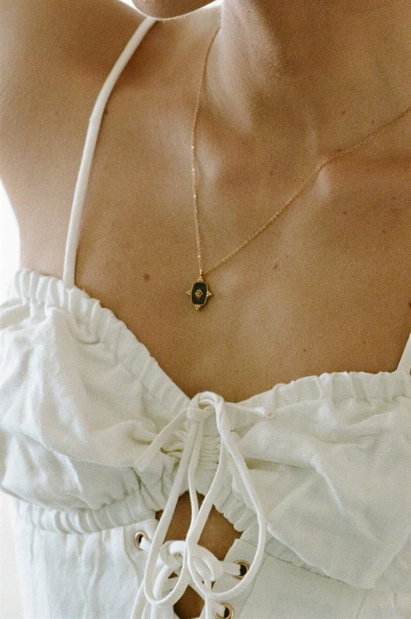 A super cute dainty necklace perfect for stacking! The Onyx Necklace is gold toned and features a fine gold chain and black pendant detailing.