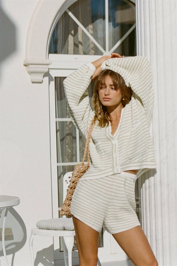 *THIS IS A FINAL SALE ITEM* A cosy pair in the cutest colourway! The Ora Knit Shorts are made from a ribbed knit in a light green and cream hue. They are a high waisted style featuring an elasticated waist and high-low hems. Get the set and pair with the Ora Knit Cardi! Designed exclusively by Sabo.