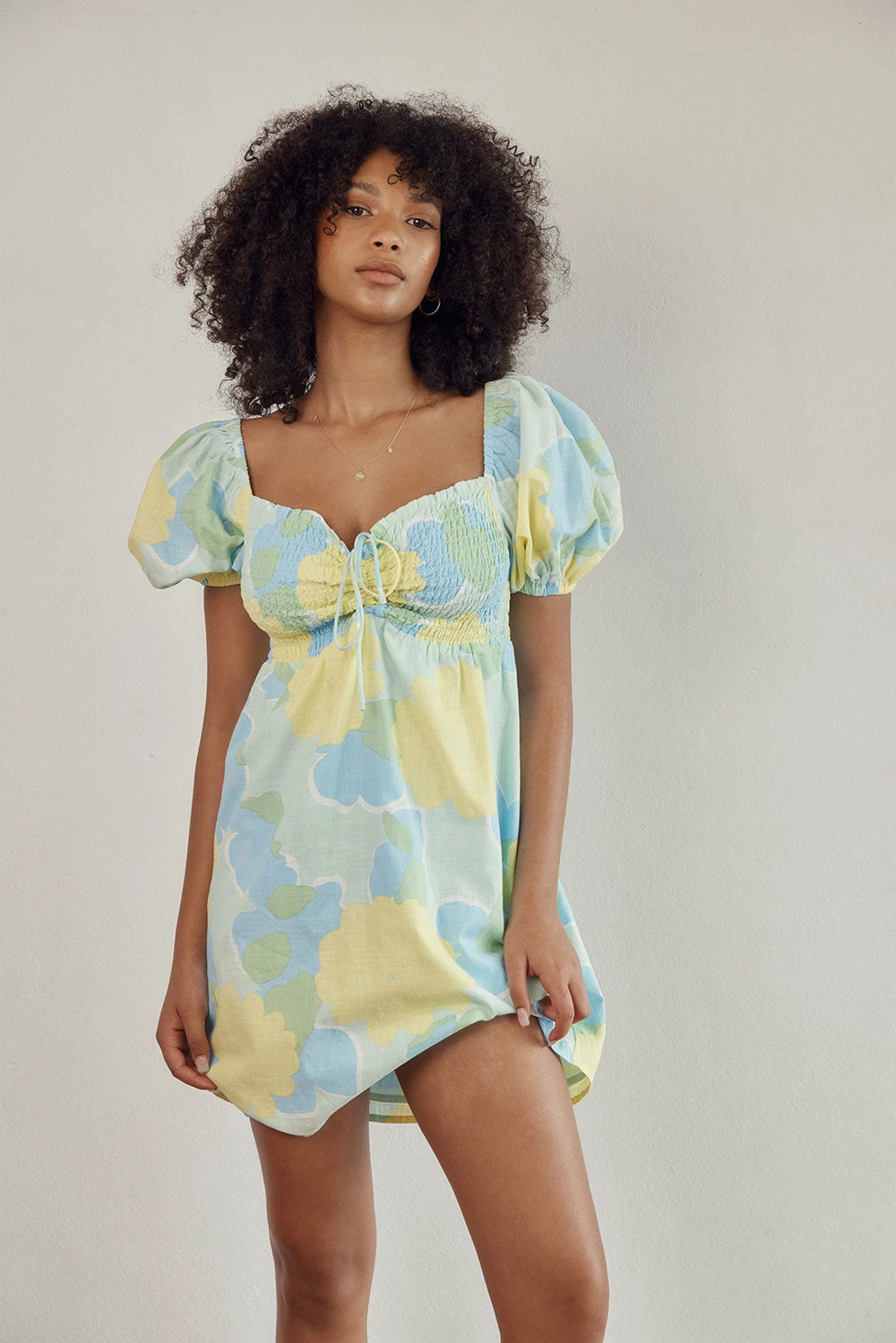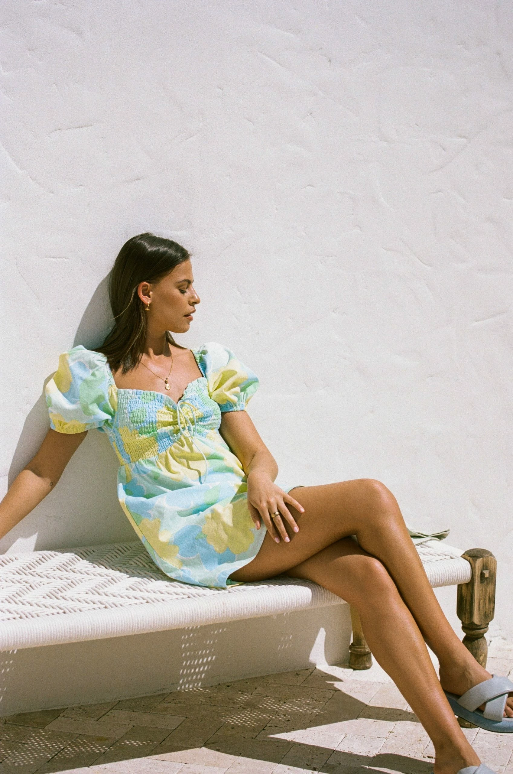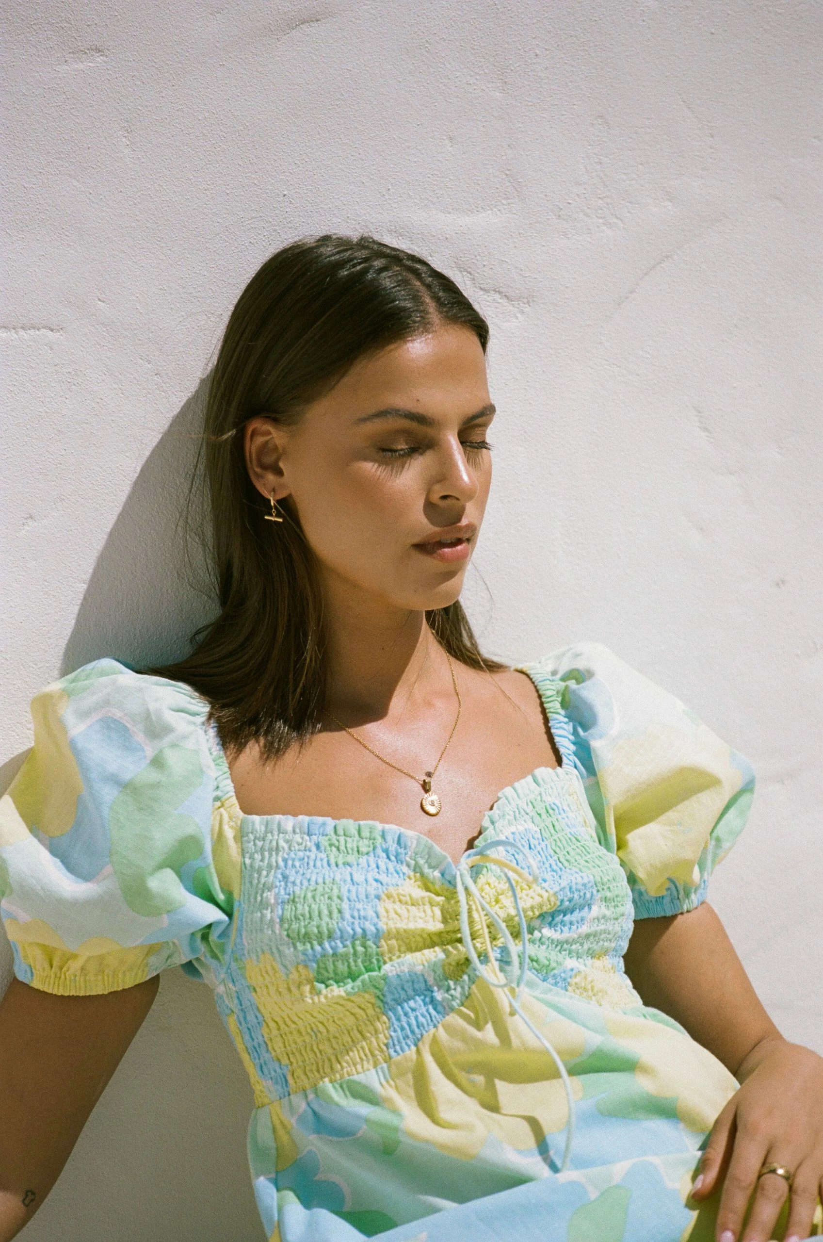 We are obsessed with our new exclusive Flutter Green print! The super cute Oura Shirred Dress is made from a high quality natural cotton slub fabric. It is a babydoll style featuring short puff sleeves, shirred bust with draw detail at centre and a flouncy skirt. Keep it casual and pair with sandals or dress it up with the Strappy Rafaela Heels! Designed exclusively by Sabo.