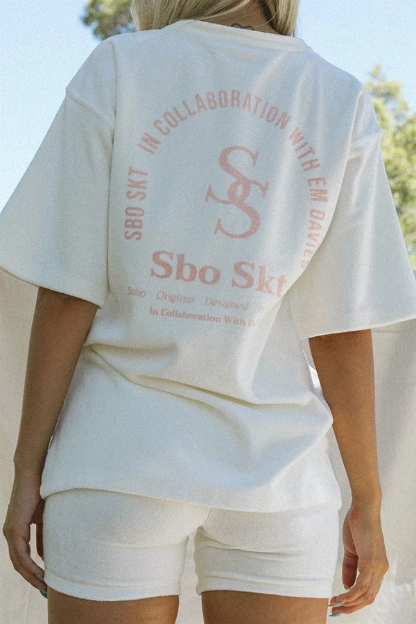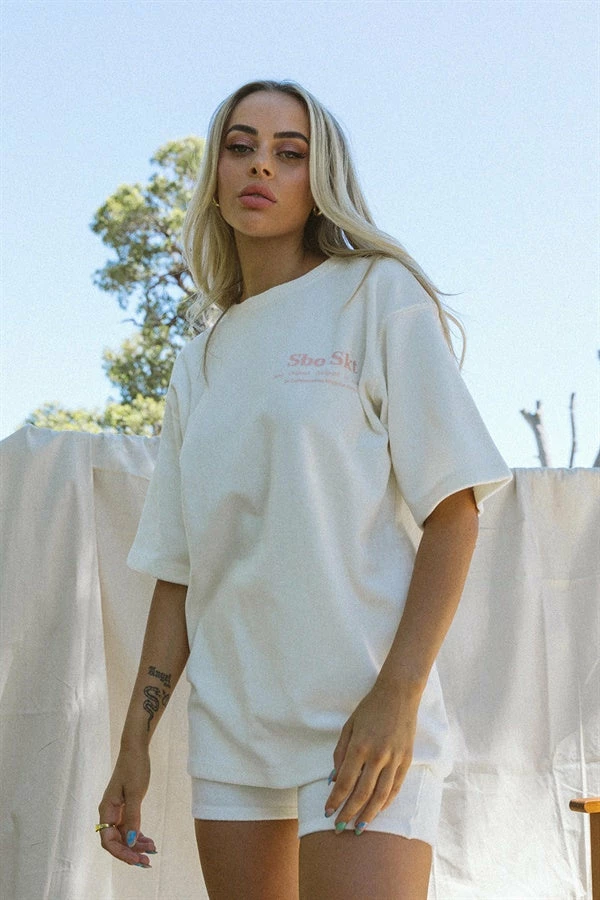 In collaboration with Em Davies, the Palm Springs Towelling Bike Shorts are made from a natural cotton blend towelling fabric in a cream hue. They are a high waisted style with an elasticated waist. Pair with the Palm Springs Towelling Tee. Exclusively designed by Sabo.