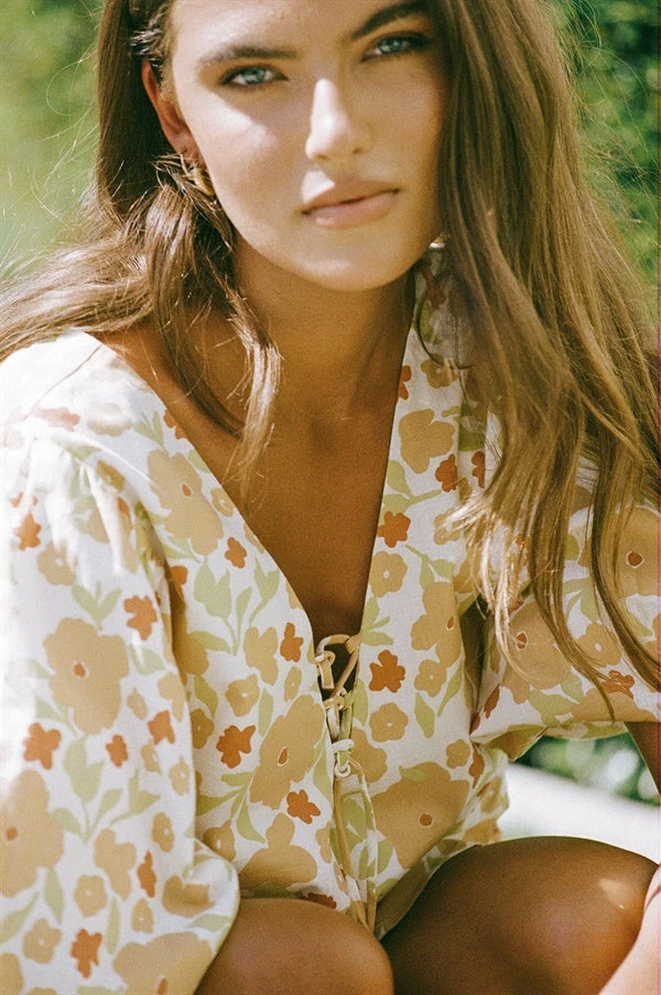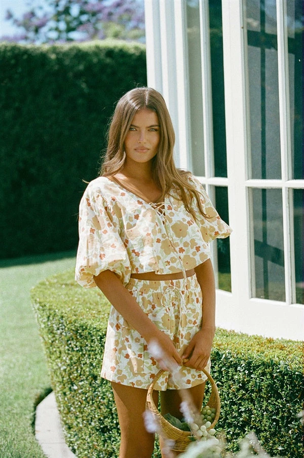 The super fresh Palmer Top is made from a high quality cotton fabric with our exclusive bold autumn floral print. It features statement bubble puff sleeves and a V neckline with lace up detailing. Style your look with the Palmer Shorts and Almia Sunglasses! Designed exclusively by Sabo.