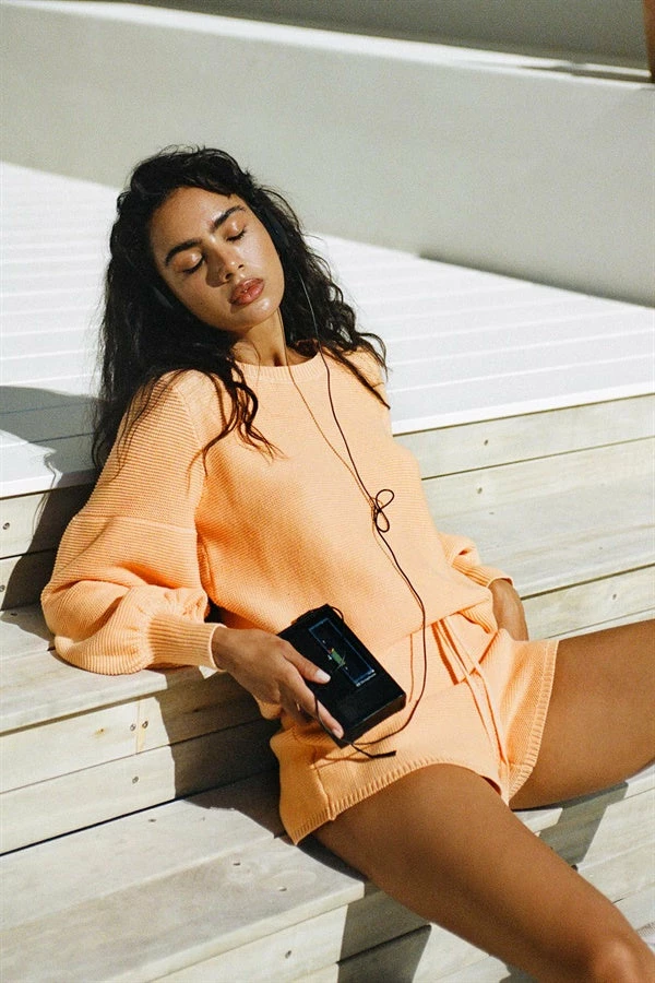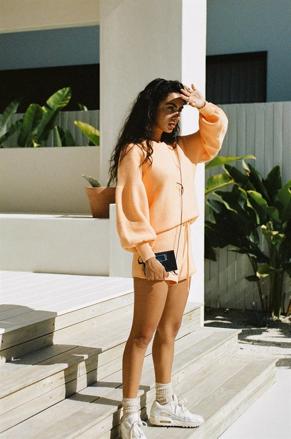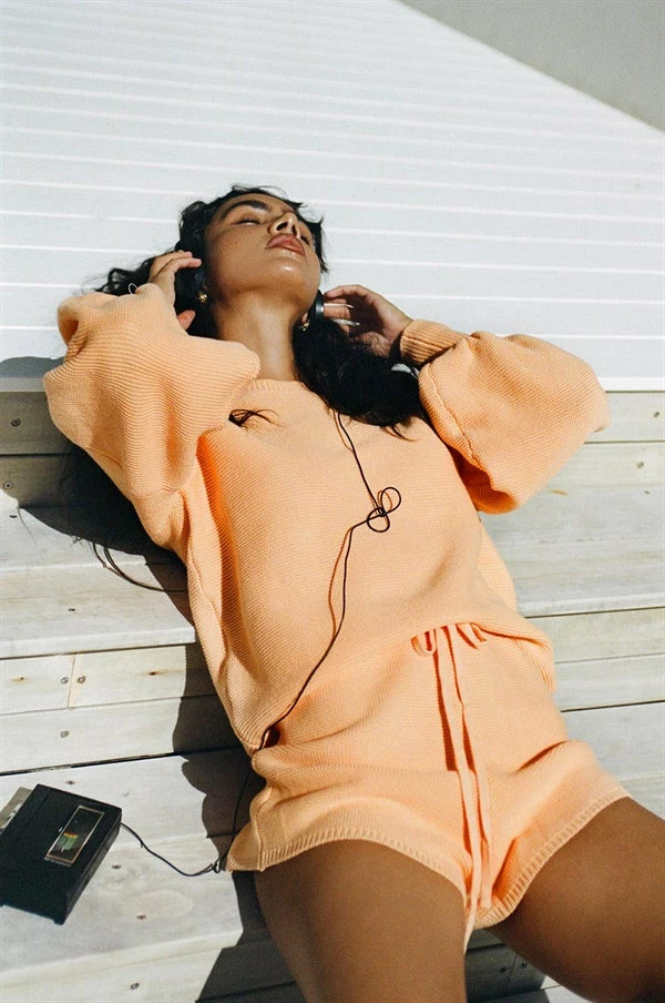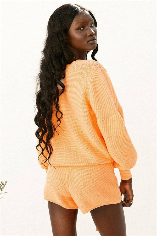 *THIS IS A FINAL SALE ITEM* Your favourite cosy set now in a fresh colourway! The Peach Knit Shorts are made from a natural knitted cotton fabric in an orange hue. They are a high waisted style featuring a ribbed elasticated waistband, drawstring and high-low hems with rib detailing. Complete the look with the Peach Knit Top, Rattan Backpack and Hayworth Sunglasses! Exclusively designed by Sabo.