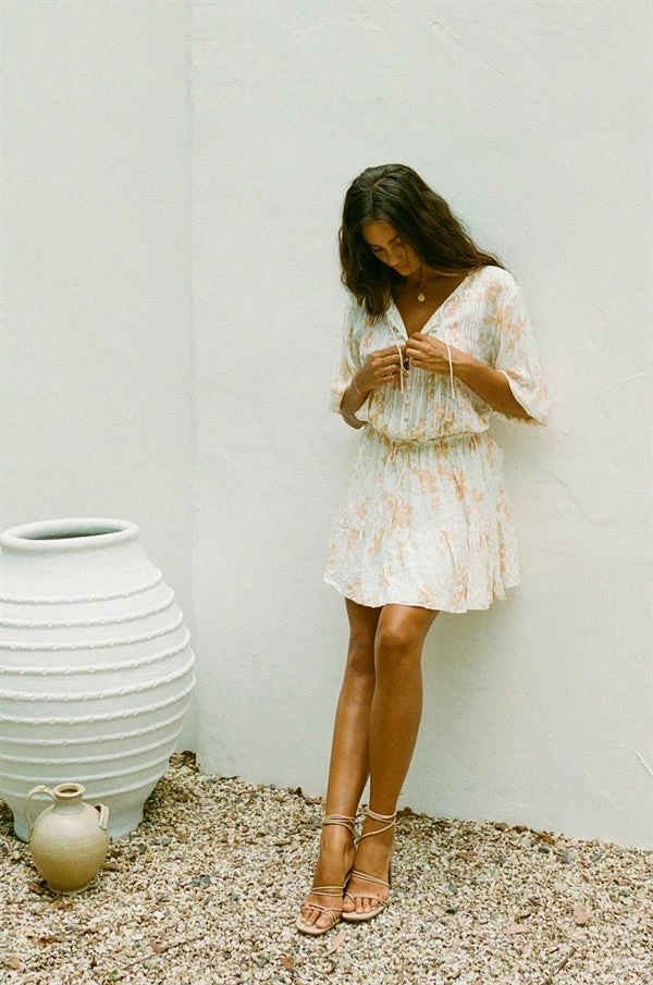 Inspired by European summers and straight from our Vacanze Collection, the Pellier Dress features our exclusive hand painted floral print, 1/2 length puff sleeves, pleat and covered button detailing at front, an elasticated waist with drawstring and a floaty two tiered skirt. Dress it up with the Transparent Mules and 18K Radiance Necklace for your next event! Exclusively designed by Sabo.