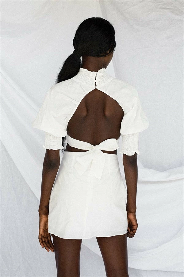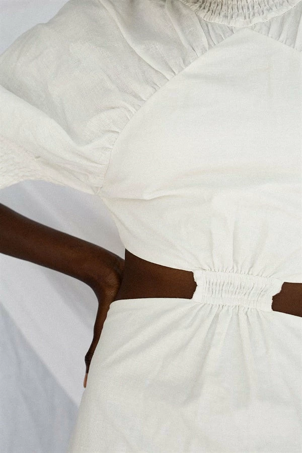 Designed to flatter, the Peta Dress is made from a high quality natural linen blend fabric in an off white hue. It features shirred detailing at neckline, cuffs and waist, cutout at waist with tie closure at back and a fitted skirt. Complete the look with the Transparent Mules and Gold Lattice Earrings for your next event! Exclusively designed by Sabo.