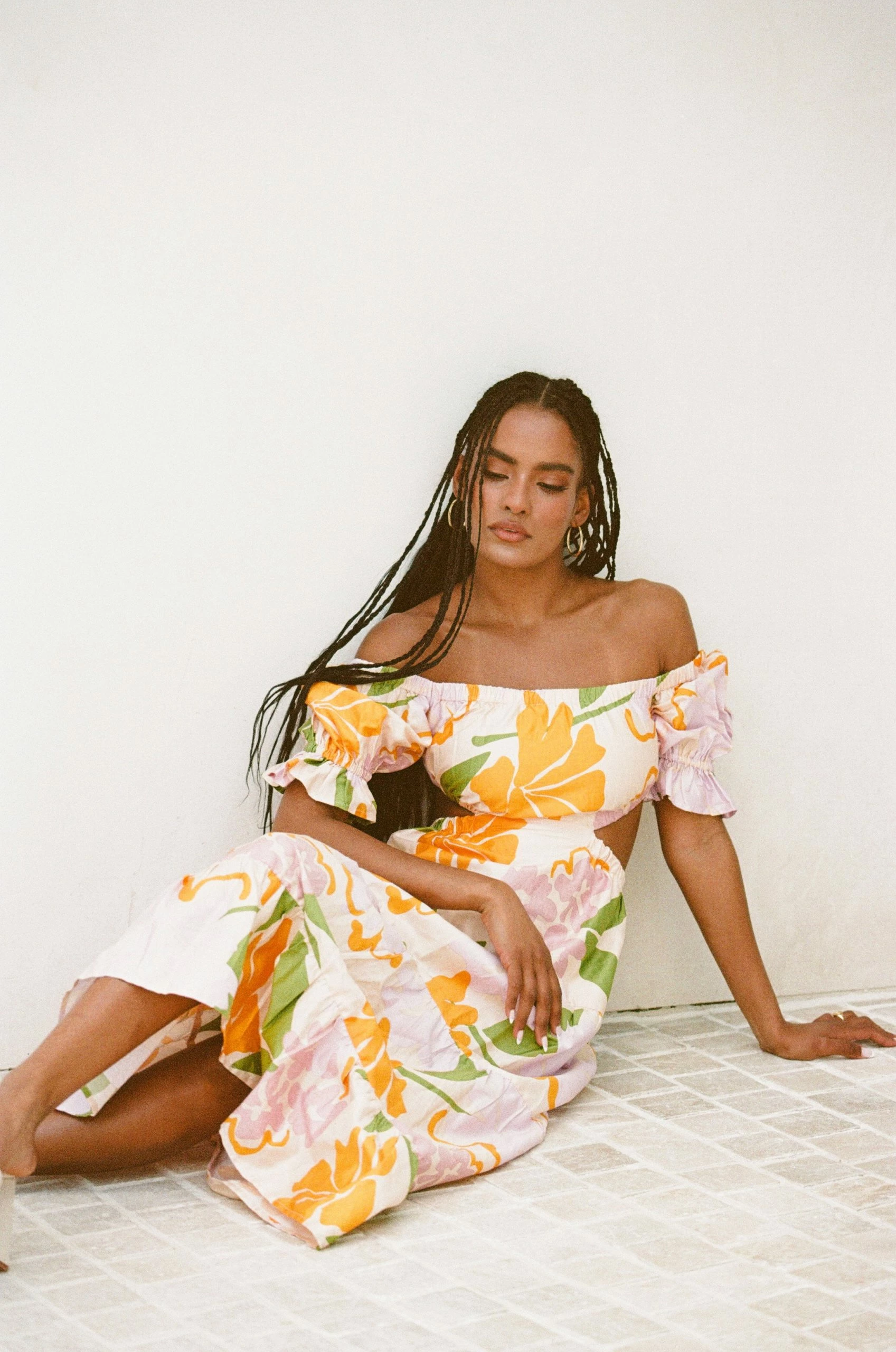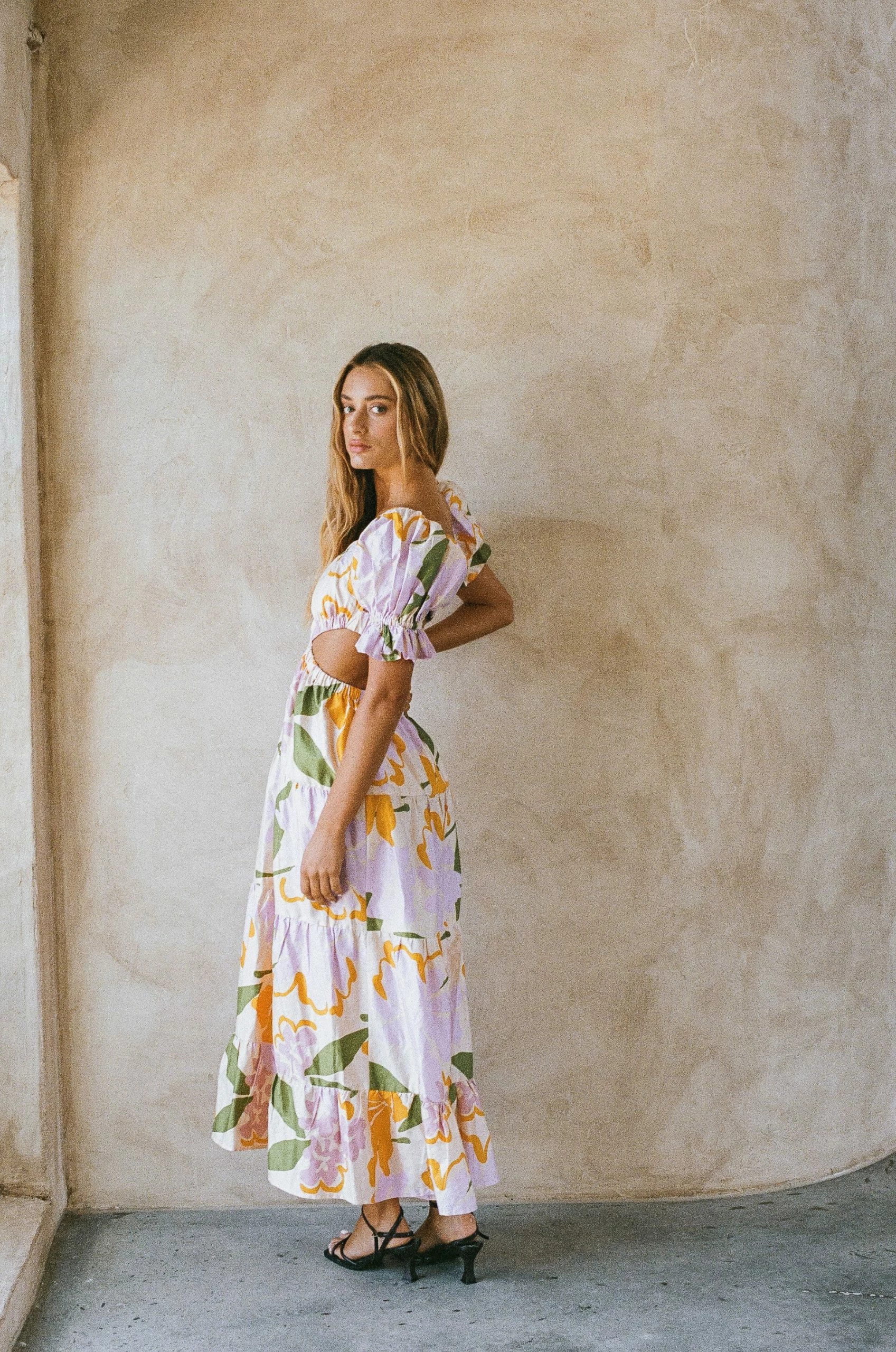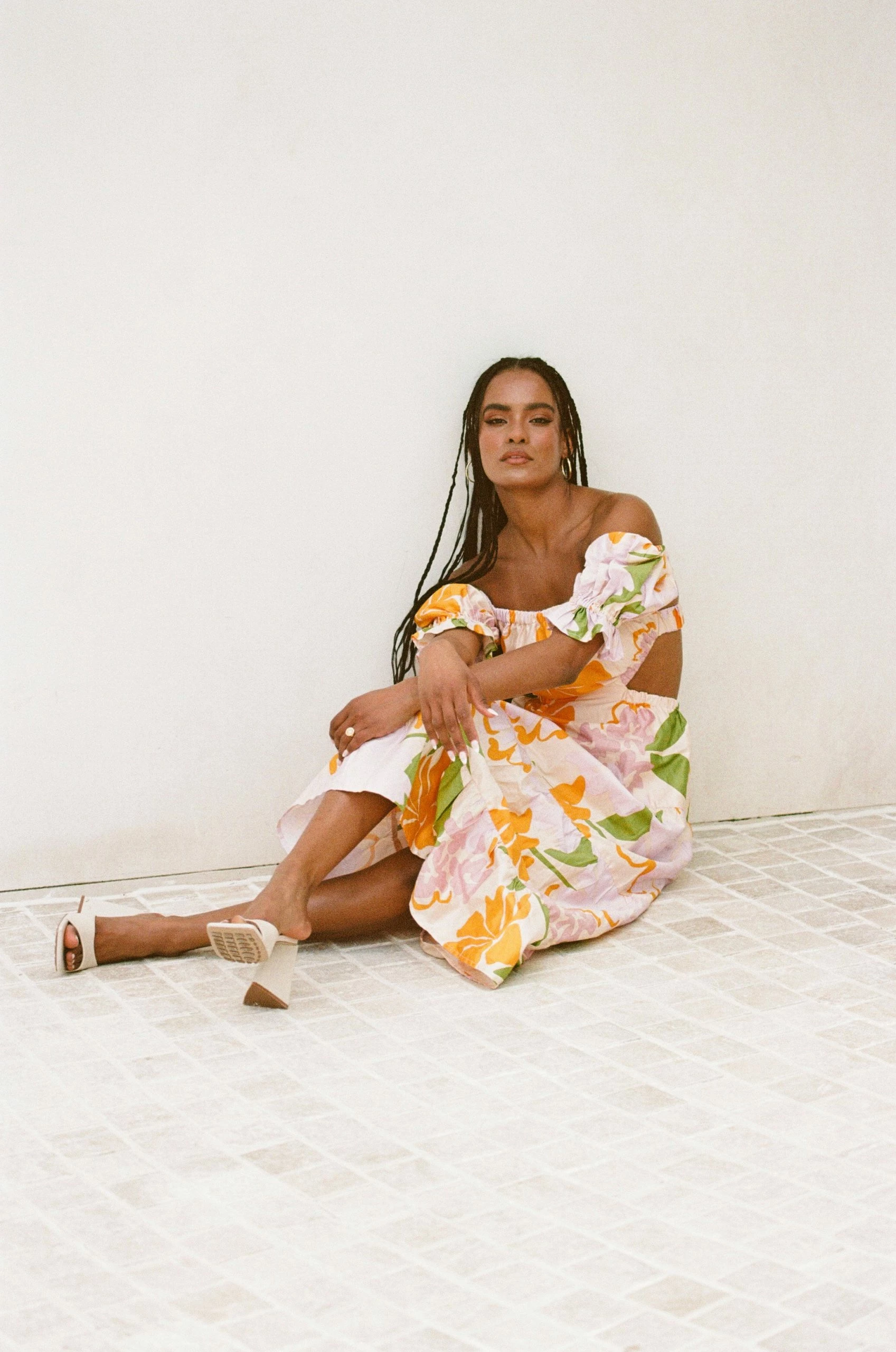 Designed to be worn at long lunches and events with friends, the Poppi Dress is made from a luxurious high quality cotton poplin fabric with our exclusive Lily Floral print. It features an open back with cross over elastic strap details, off shoulder short puff sleeves with frill cuffs, cutouts at waist with elasticated trim detailing and a flouncy tiered skirt. Style with the Zita Strappy Sandals and Tiana Bag! Designed exclusively by Sabo.