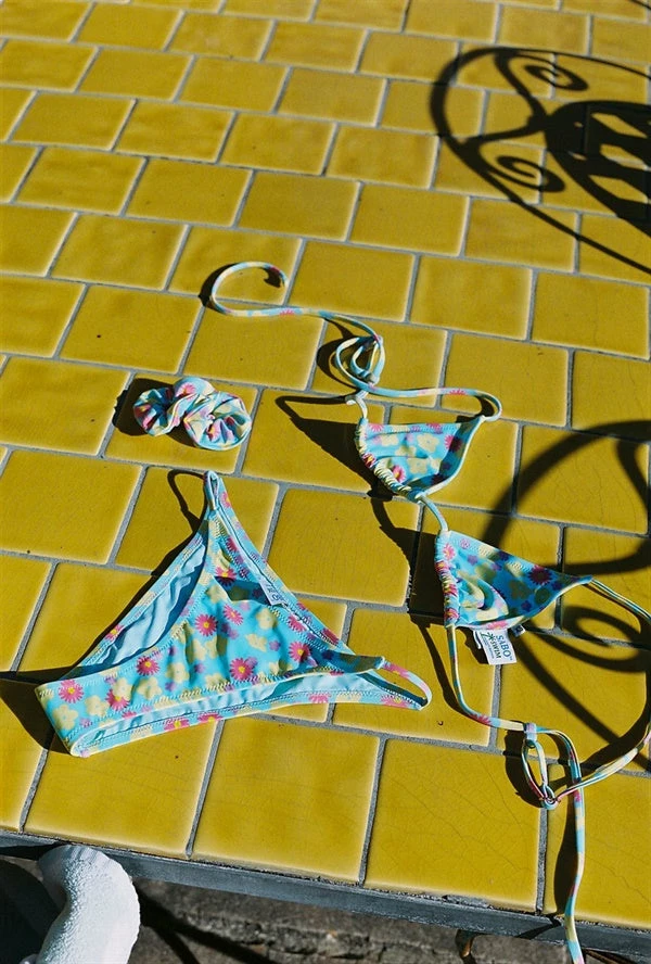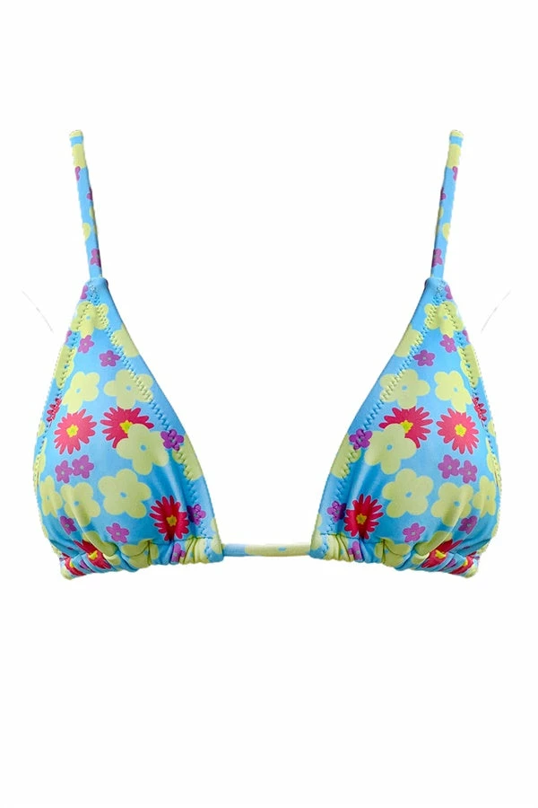 Made to be worn under the sunshine, the Poppy Tri Top is made from a stretchy swim fabric in our exclusive blue retro floral print. It features micro tri cups, thin adjustable shoulder straps and a tie at back. Get the look with the Poppy Tie Bottoms, blue Breeze Cover Up and blue Retro Floral Scrunchie. Designed exclusively by Sabo.