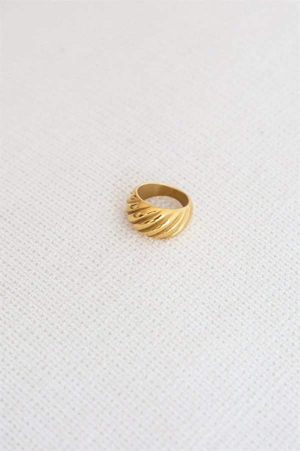 Accessorise your outfit with the bold Priya Ring. It is gold toned and features twirl detailing throughout. Perfect for stacking!