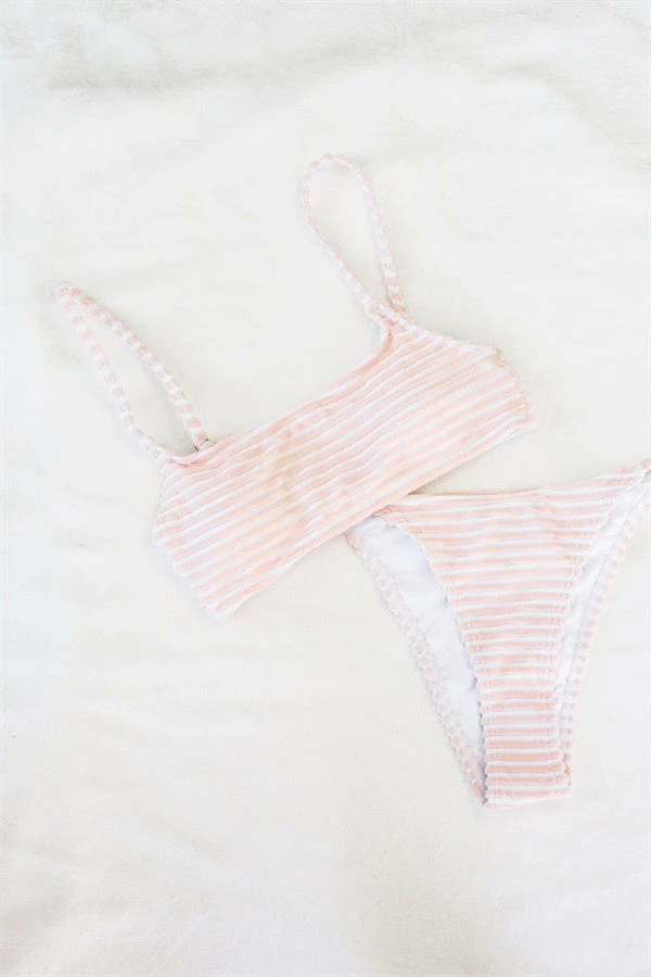 *THIS IS A FINAL SALE ITEM* The Samui Scoop Bandeau is made from a textured stripe chenille fabric in a soft pink and contrast white hue. It is a bandeau style featuring thin adjustable straps, clasp closure at back and includes removable padding. Complete the look with your favourite pair of bottoms! Exclusively designed by Sabo.