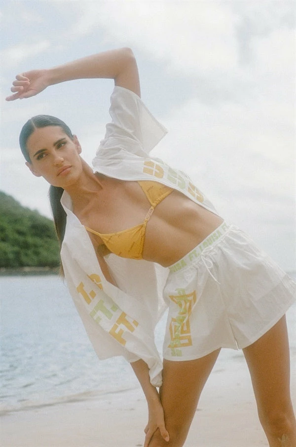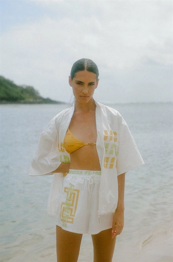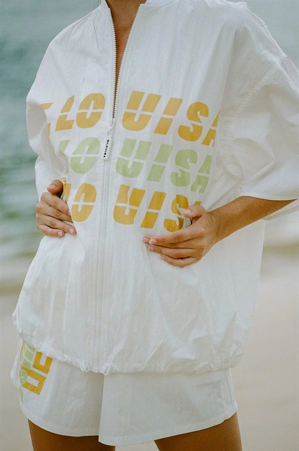 The Racquet Wind Breaker Shorts are a high waisted style featuring a raw elastic waistband with FT. Louisa printed detailing and signature yellow and green printed graphics at side. By FT. Louisa.