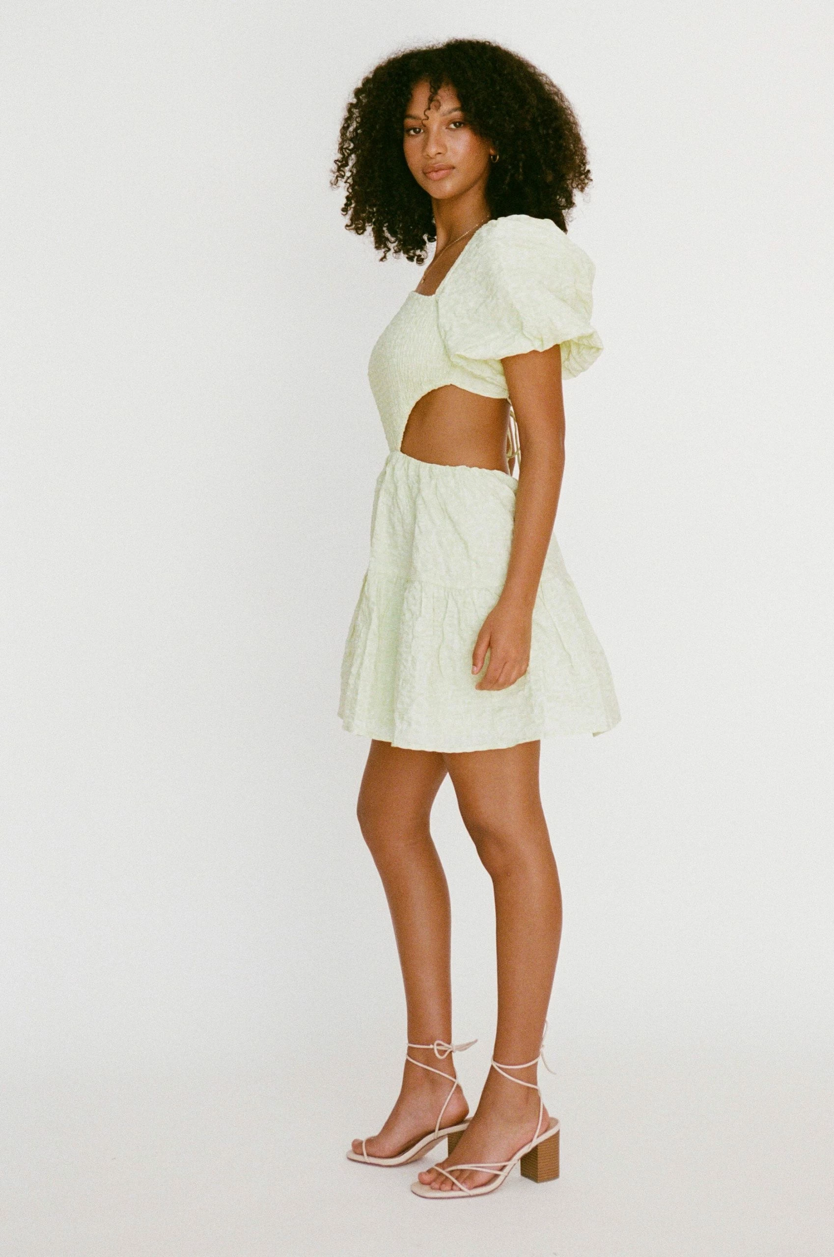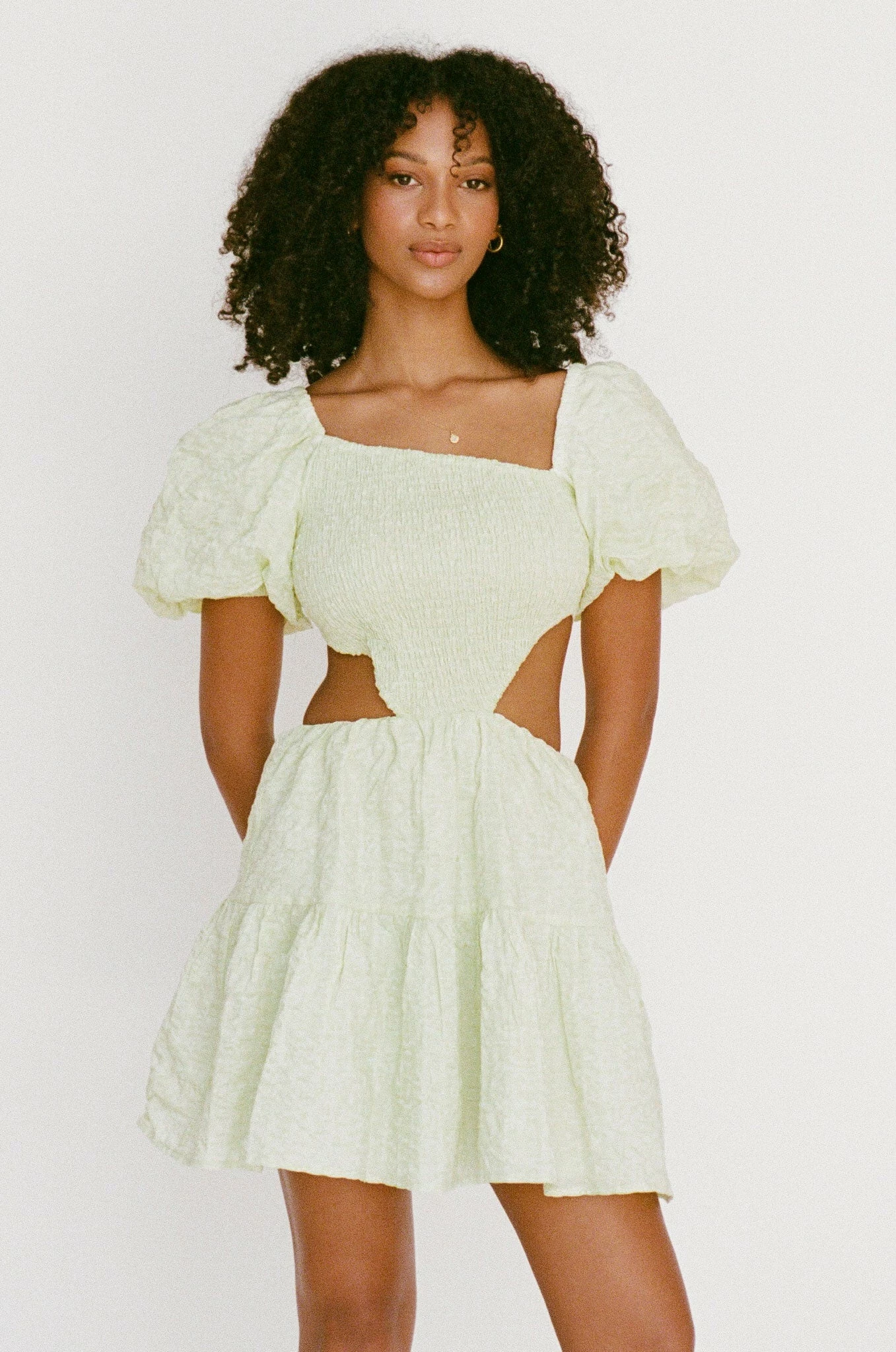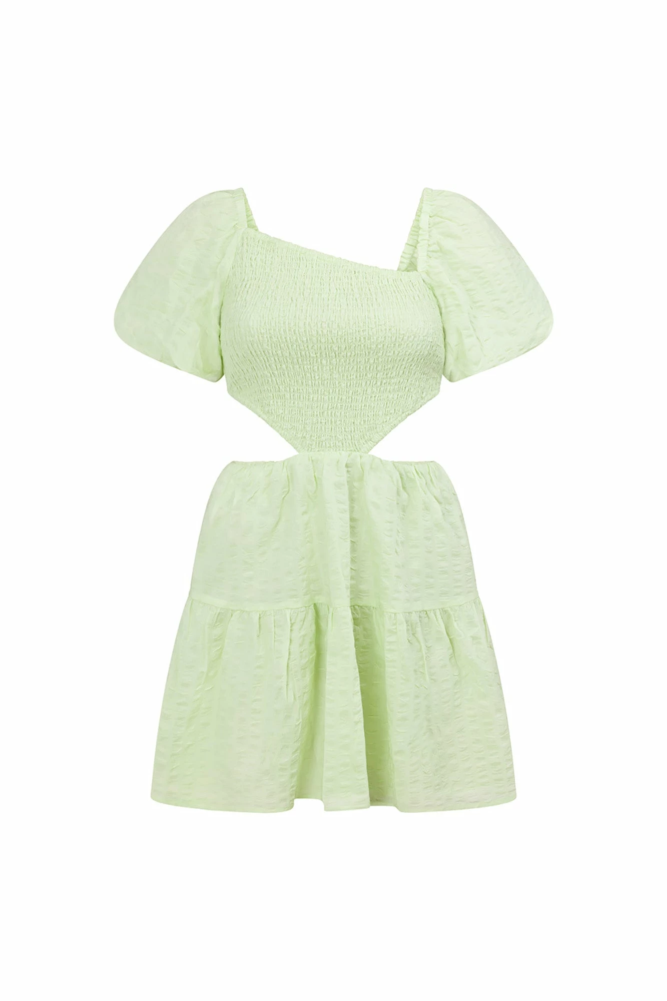 The perfect pop of colour for the warmer months! The Raffy Dress is made from a textured natural cotton seersucker fabric in a green hue. It features an open back with strappy details, short puff sleeves, asymmetric neckline, shirred bodice, cutouts at waist and twin tiered flouncy skirt. Dress it up with the Strappy Rafaela Heels and Jamilla Bag! Designed exclusively by Sabo.