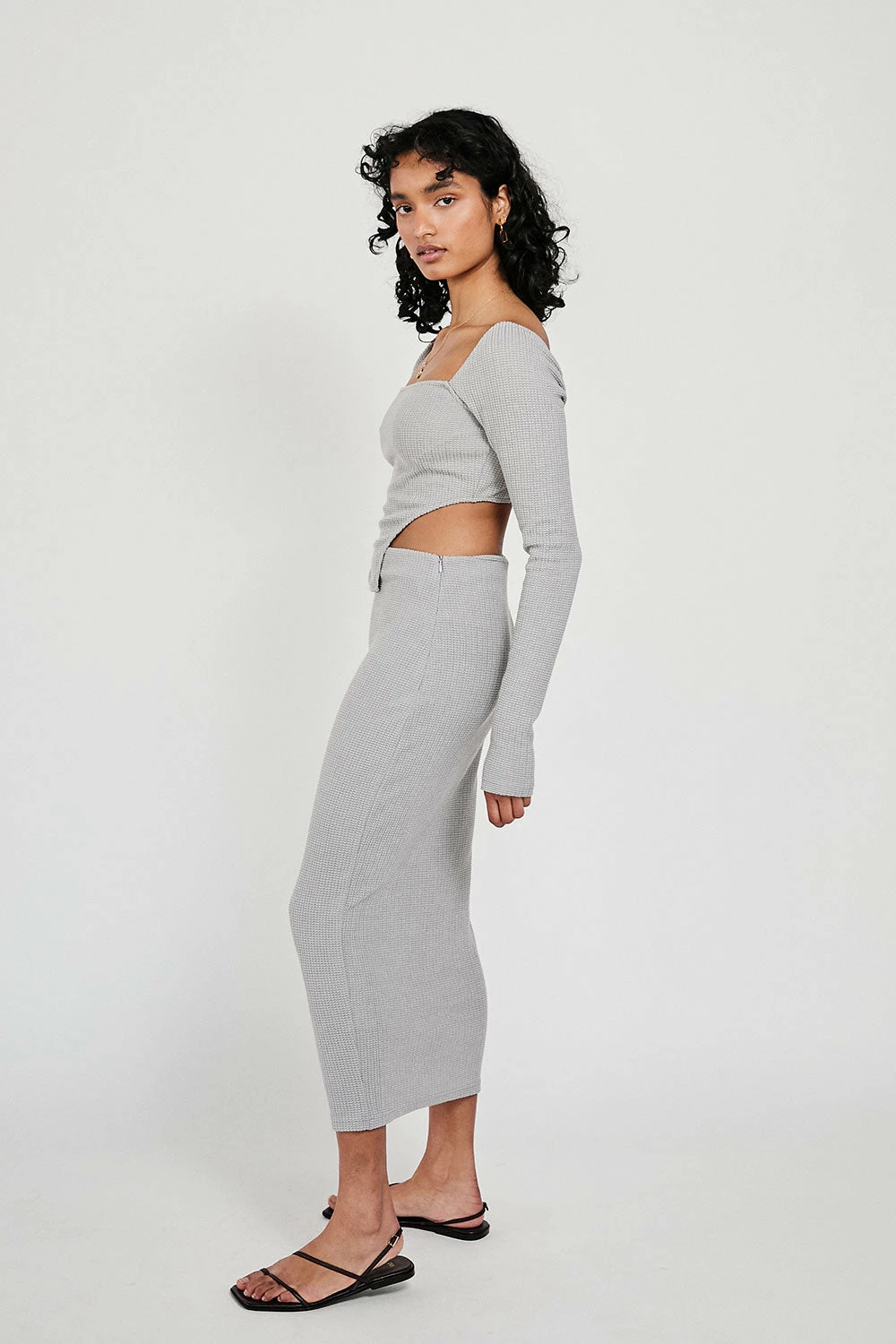 A super cute staple piece in a beautiful textured grey fabric, the Rakell Midi Skirt is a high waisted fitted style. Complete your look with the Rakell Top and Strappy Rafaela Heels! Designed exclusively by Sabo.