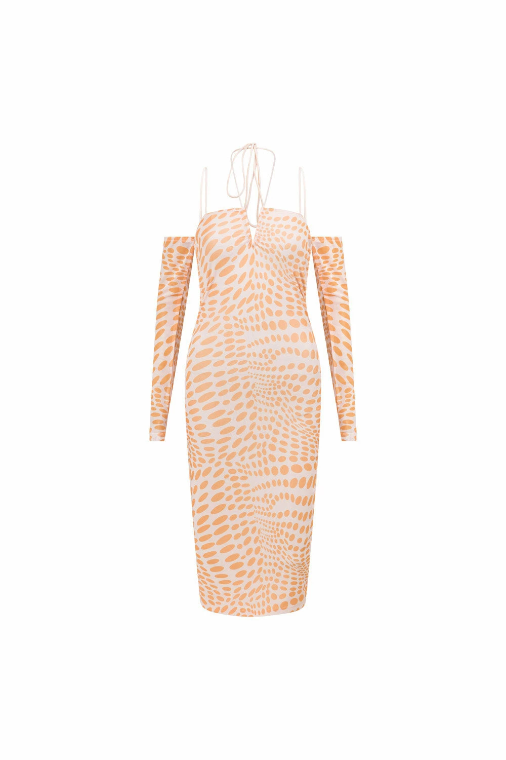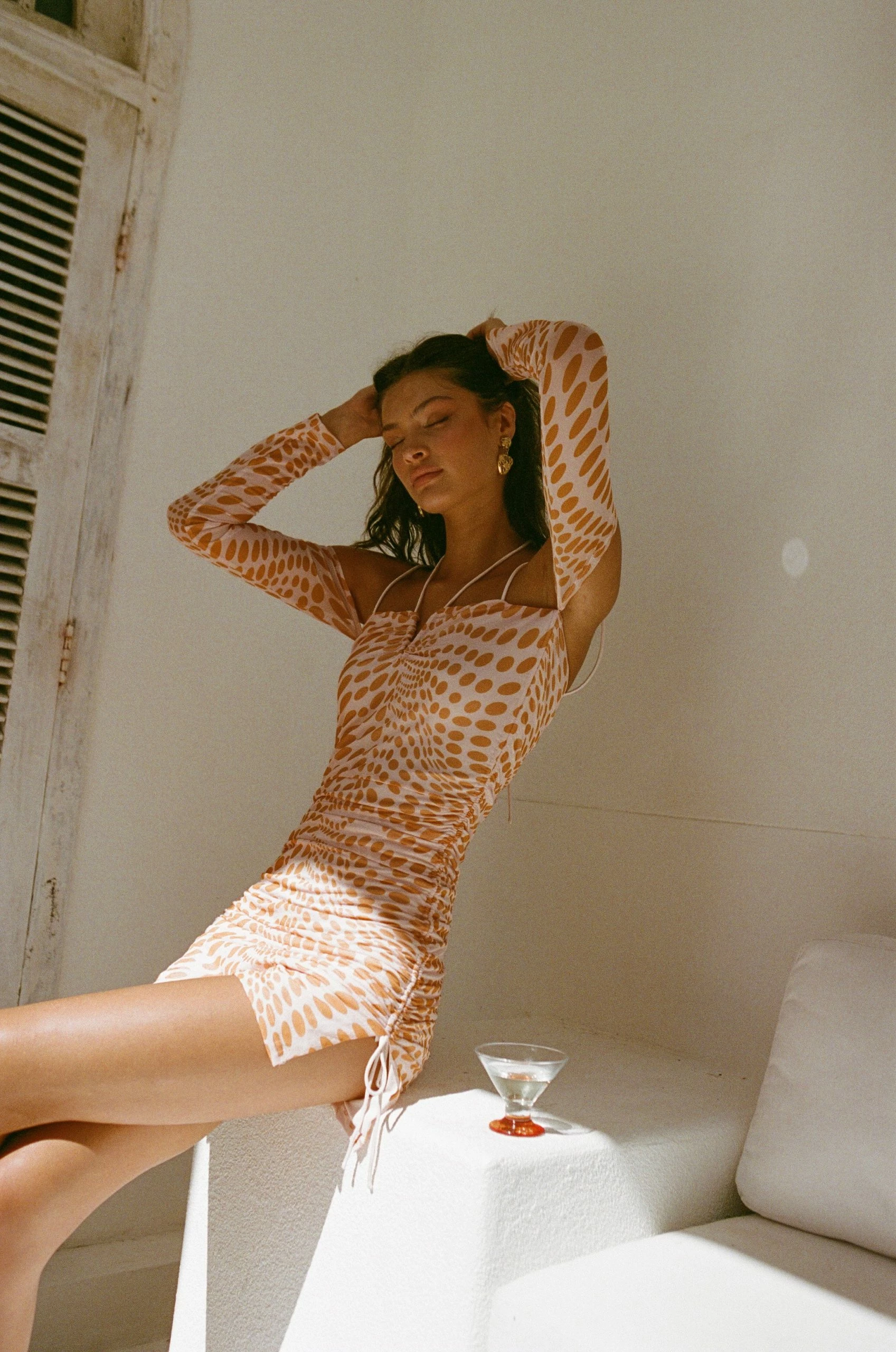 Show off your curves in the Raniella Dress, made from a stretchy slinky fabric with orange spots throughout. It features fitted off shoulder sleeves, thin straps with halter neck tie, dip V detail at centre bust, gathered draw details and splits at sides. Can be adjusted to be worn as a mini or midi! Designed exclusively by Sabo.