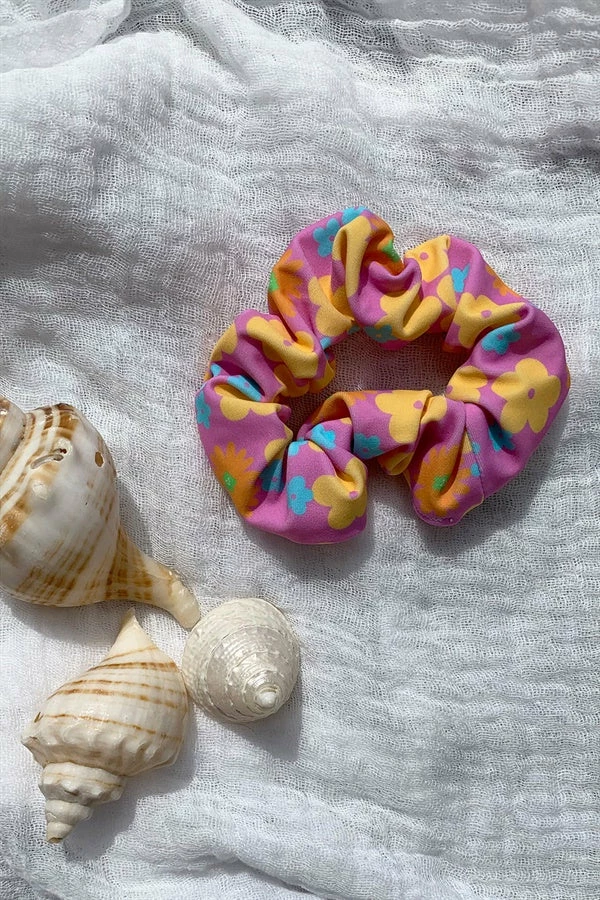 Complete your beach outfit with the Retro Floral Scrunchie, made from our exclusive retro floral print in pink. Complete the look with the Jasmine Tri Top, Jasmine Tie Bottom and Breeze Cover Up! Designed exclusively by Sabo.