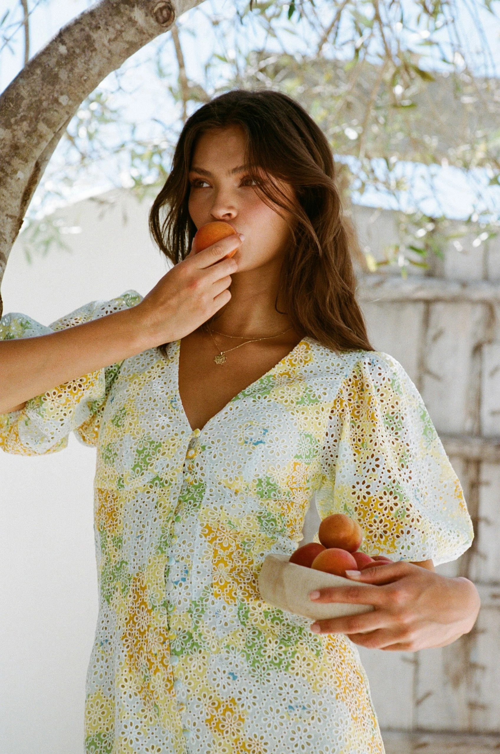 Designed to flatter! The Rexa Puff Dress is made from a high quality natural cotton broiderie fabric with our exclusive tropical anemone print. It features bold puff sleeves, V neckline, covered button details at centre front and fitted waist. Dress it up with the Strappy Leila Heels and Tiana Bag! Designed exclusively by Sabo.
