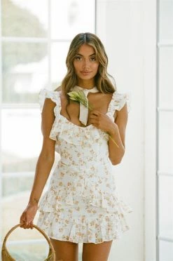 Perfect for your next event and a must-have in your vacation suitcase! The Rialto Dress is made from a raw natural cotton cheesecloth fabric with our exclusive spring buttercup print throughout. It features a scoop neckline with frill detailing at sleeves, neckline and skirt and boning at waist. Complete the look with tan heels and gold accessories! Designed exclusively by Sabo.