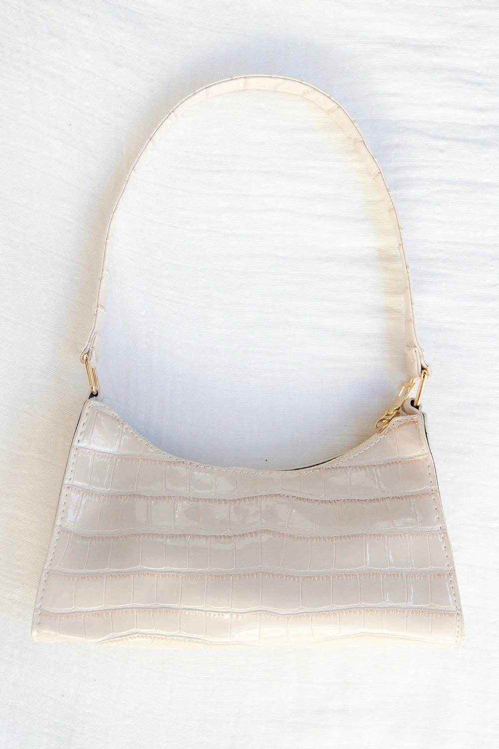 The perfect addition to your weekend look! The Riella Bag is made from a vegan croc skin in a blush ivory hue. It features a shoulder strap and zip closure.