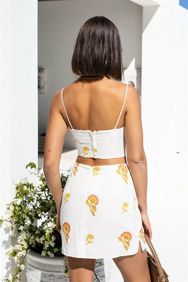 The ultra chic Rolando Skirt is made from a high quality linen cotton blend fabric with our exclusive sunset emblem floral print throughout. It is a high waisted style featuring a split at thigh. Get the look with the Rolando Top, Srappy Abella Heels and Reyna Earrings! Exclusively designed by Sabo.