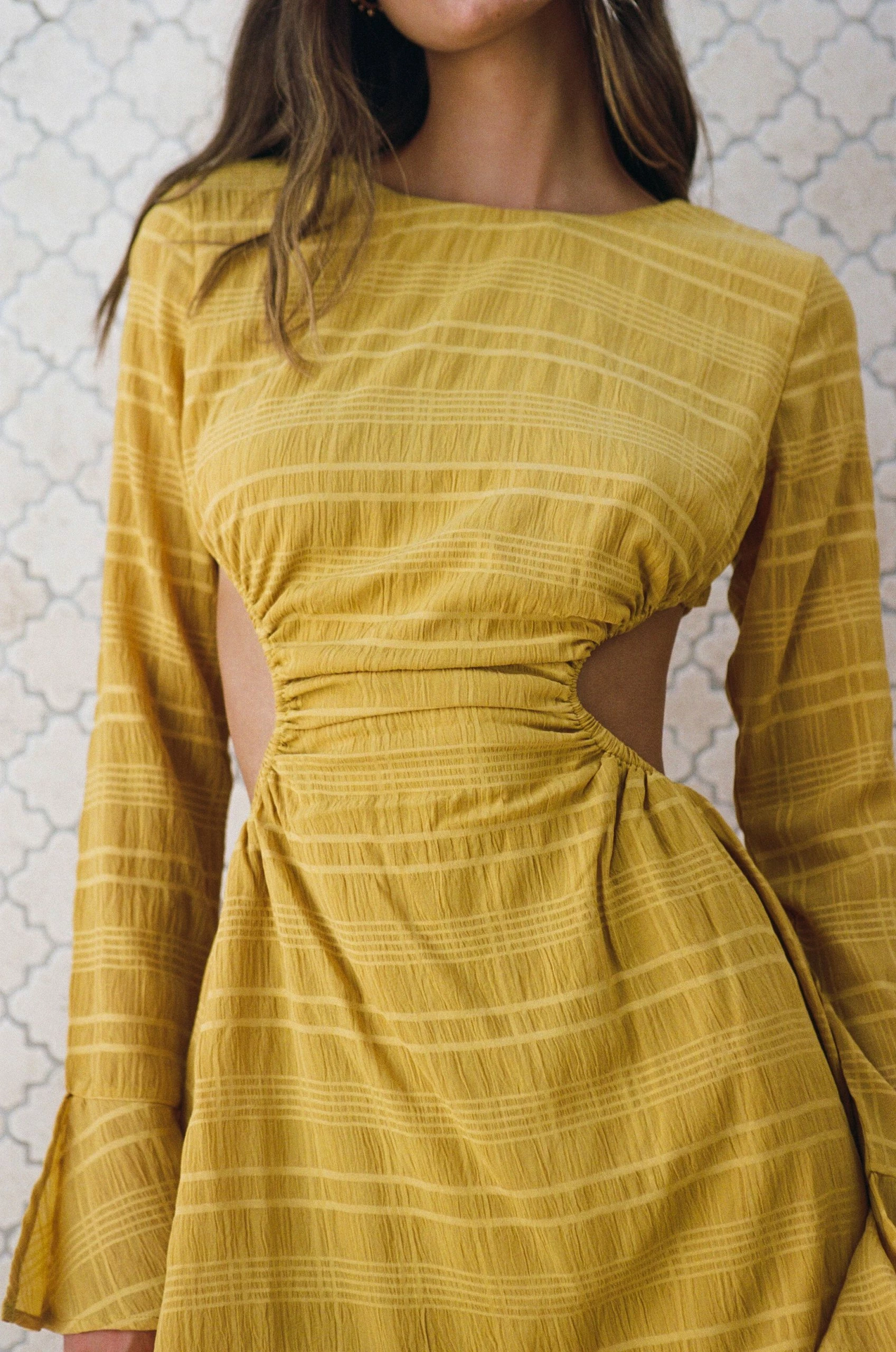 Inspired by sun drenched afternoons with friends, the Romi Dress is made from a lightweight crepe-feel fabric with self stripes throughout. It features a high rounded neckline, full length sleeves with flared cuffs and cutouts at sides of waist. Dress it up with the Strappy Leila Heels and Transparent Moon Rock Necklace! Designed exclusively by Sabo.