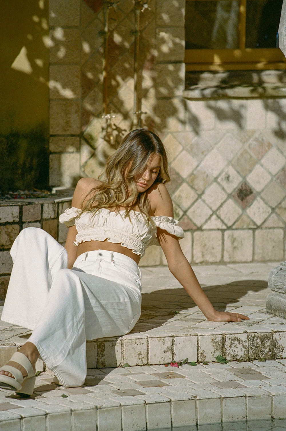 Pair it with your denim, the Rue Top is made from a structured fabric in a cream hue. It is an off shoulder style featuring little puff sleeves, ruffle details across neckline, sleeve cuffs and hem and elastic panel details throughout. Designed exclusively by Sabo.