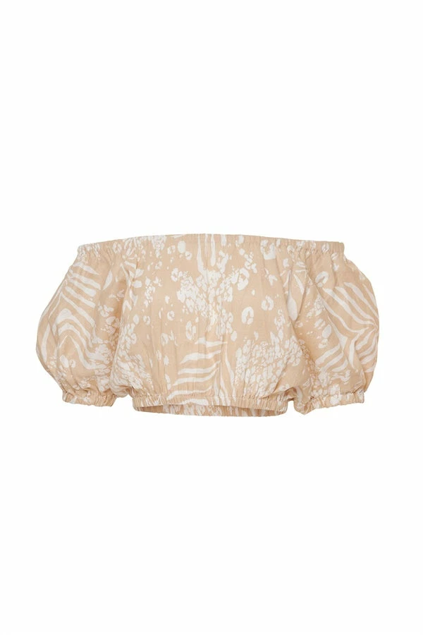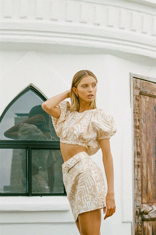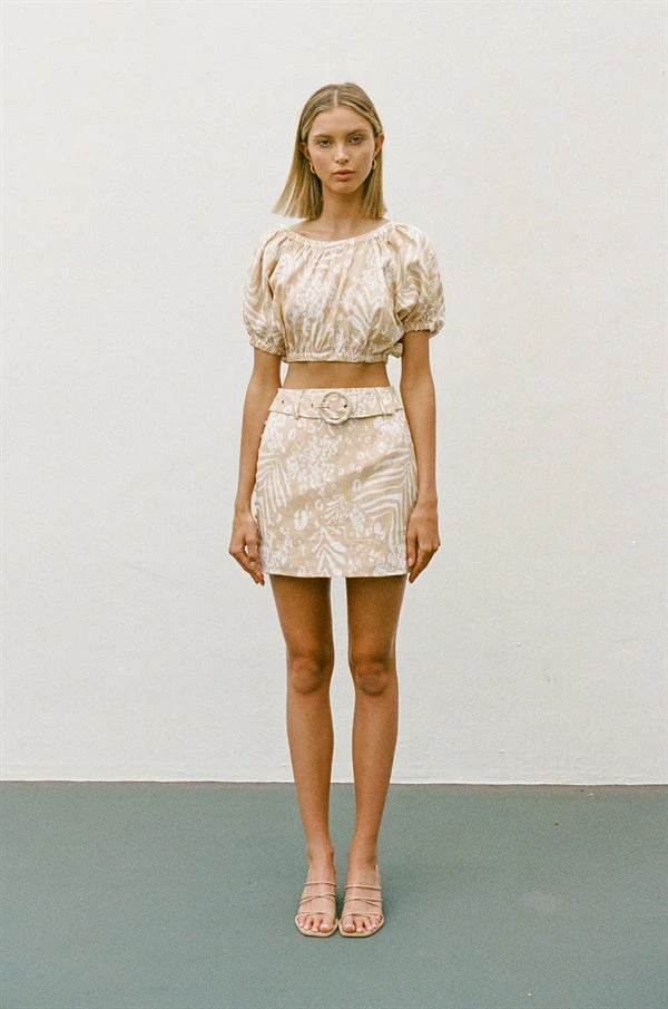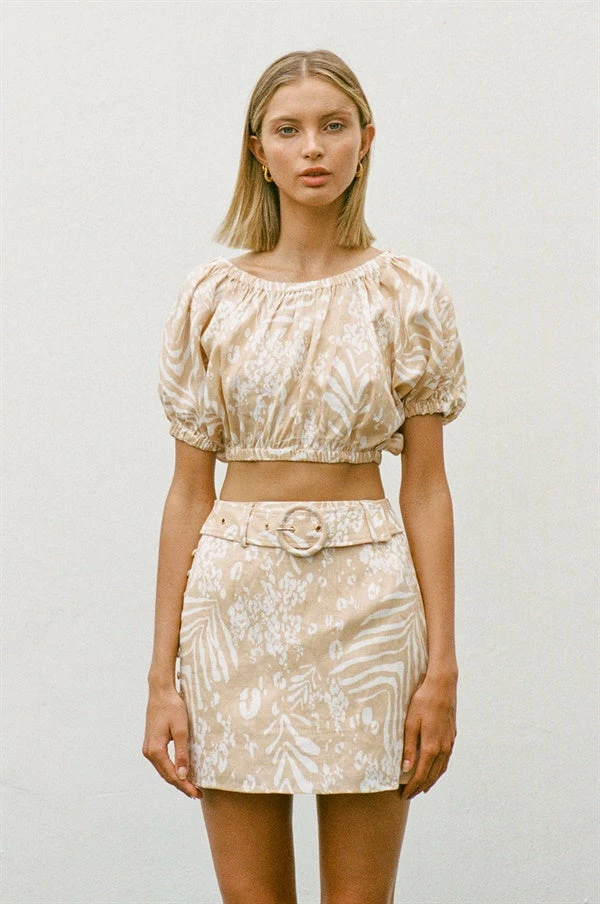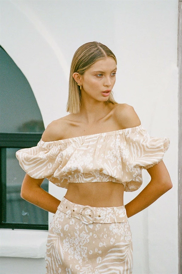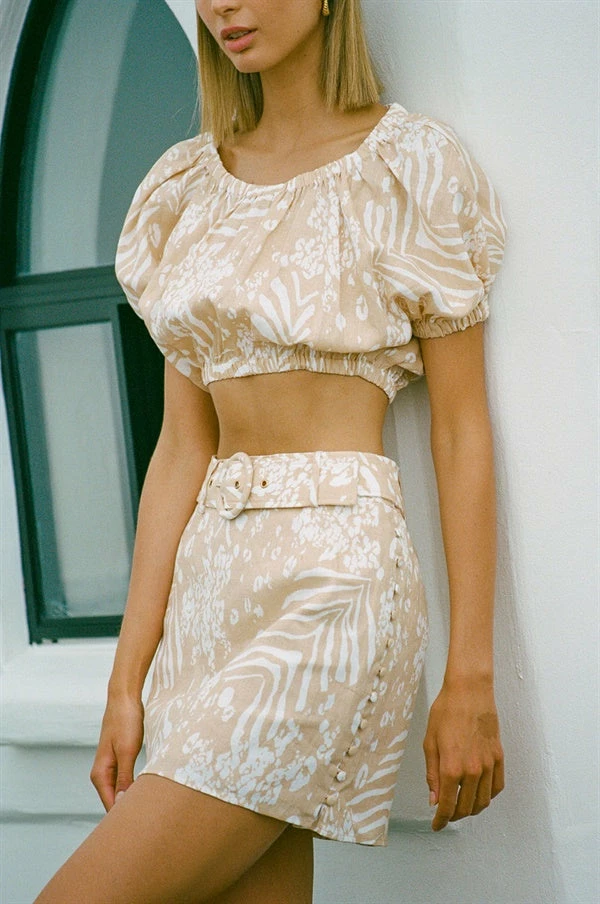 Inspired by moonlit vacation nights with friends, the Sakura Linen Top is made from a high quality natural linen fabric with our exclusive animal print. It is a cropped style featuring elastic detailing at neckline, waist and cuffs of sleeves and relaxed flouncy fit. Get the look with the Sakura Linen Skirt! Designed exclusively by Sabo.