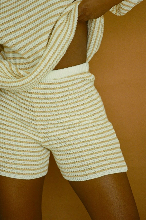 *THIS IS A FINAL SALE ITEM* A basic style with a twist! The Samia Shorts are made from a soft knit with cream and tan stripes throughout. They are a high waisted fitted style featuring a contrast cream ribbed waist and fitted through the legs. Exclusively designed by Sabo.