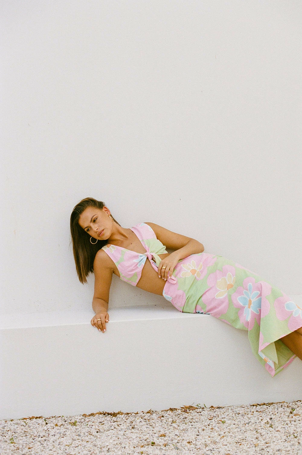 The resort inspired Samira Top features our brand new exclusive Hana Green print. It is made from a high quality cotton slub fabric and features a plunging V neckline with tie detail at centre front and stunning cross over panels at back. Get the look with the Samira Midi Skirt and Strappy Asteria Heels! Designed exclusively by Sabo.