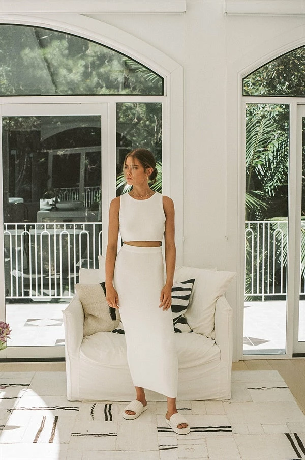 *THIS IS A SAMPLE* I am a one off Sabo sample of the Heather Knit Skirt – White I have a small faint black mark on my bottom front . I cannot be returned, so I’m all yours to love and wear as your very own.