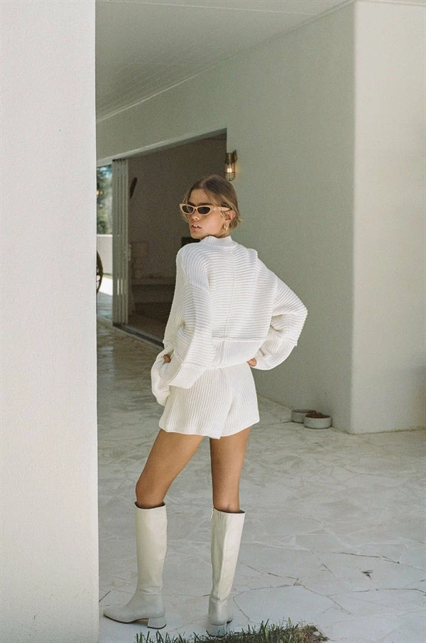The trans seasonal Sandro Shorts are made from a soft ribbed knit fabric in an off white hue. They are a high waisted style featuring an elasticated waist and high-low hems. Get the set with the Sandro Sweater and pair with the Nadia Pleated Bag! Designed exclusively by Sabo.