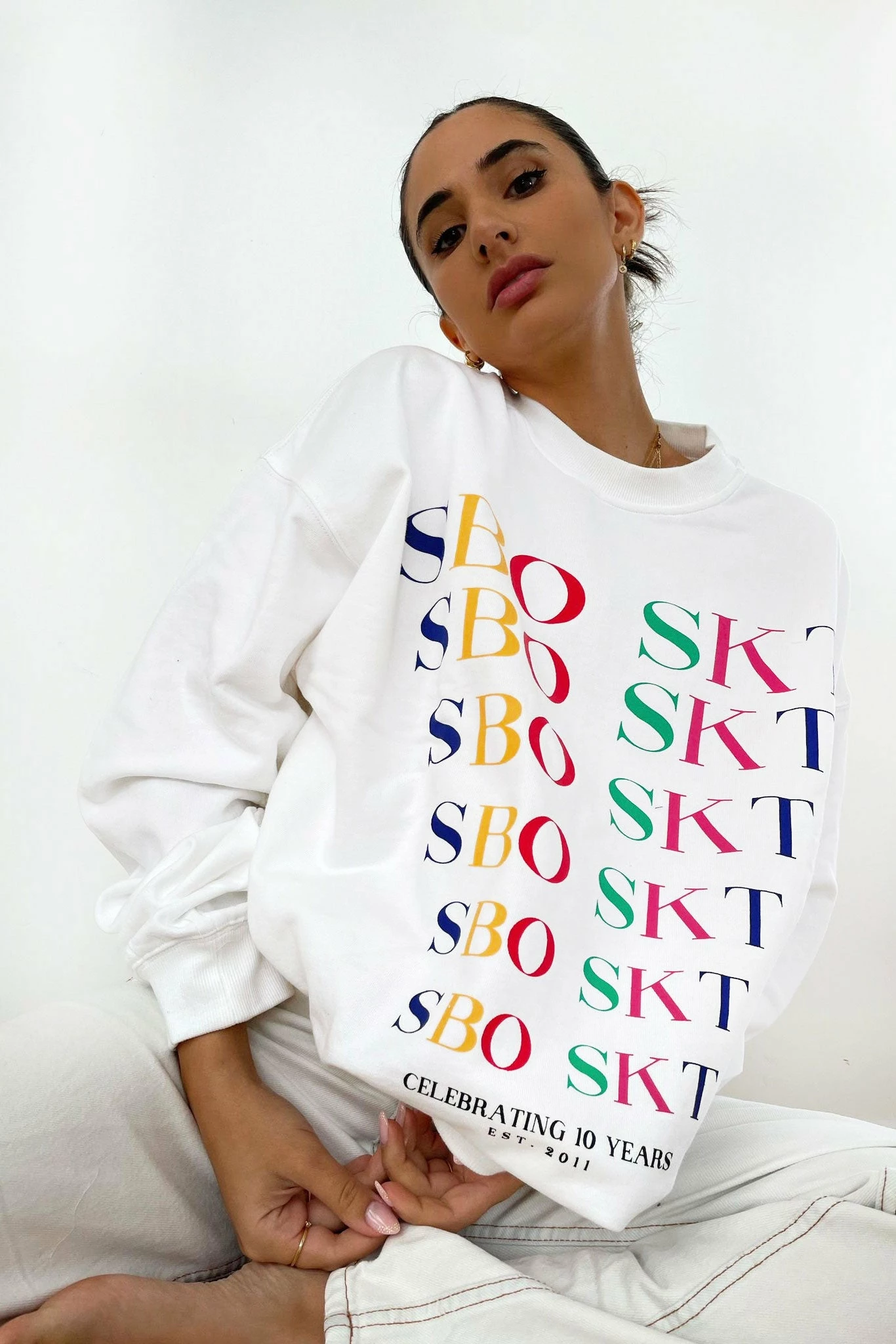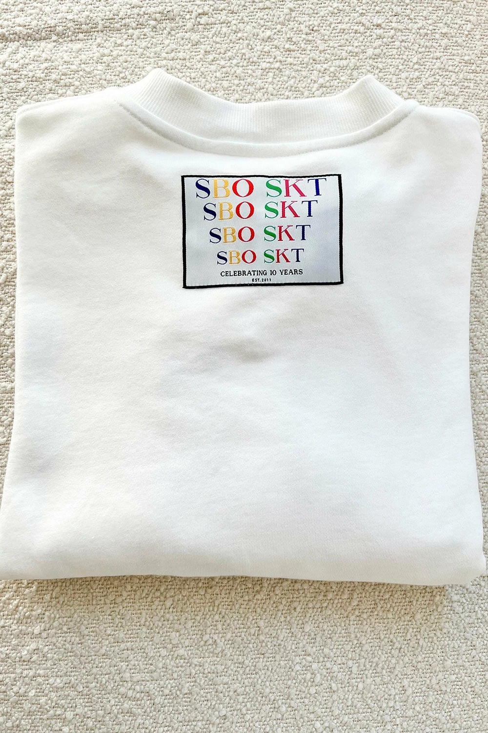 Celebrating 10 years of Sabo, the limited edition Santa Monica Sweater is made from a natural terryback cotton in white. It features a crew neckline, full length sleeves, ribbed trims, multi coloured SBO SKT print detailing at front and a patch at centre back. Designed exclusively by Sabo.