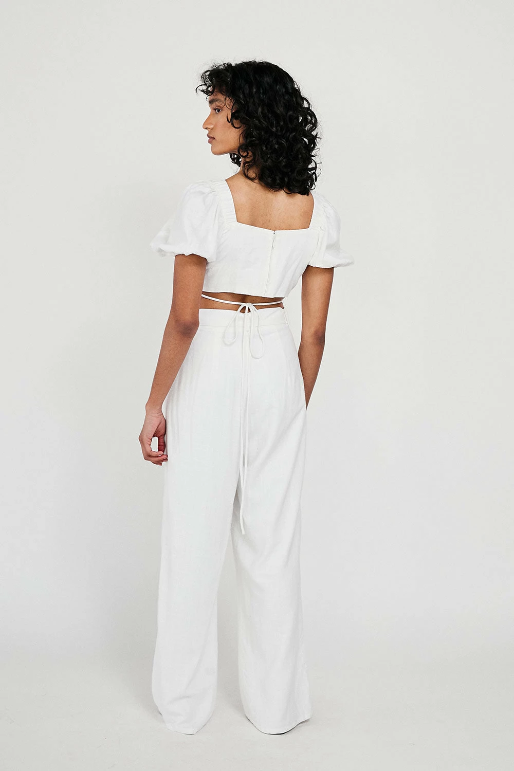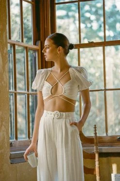 A neutral piece you can wear as a set or pair back with jeans! The Saylor Top is made from a stunning linen blend fabric in off white. It features short puff sleeves, cutout at centre bust and stunning tie details at chest and waist. Get the look with the Saylor Pants! Designed exclusively by Sabo.