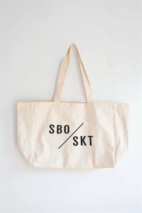 The perfect bag for weekend farmers markets! The SBO Market Tote Bag is made from a natural cream canvas and features long arm straps and black SBO SKT printed detailing. The perfect alternative to plastic bags!