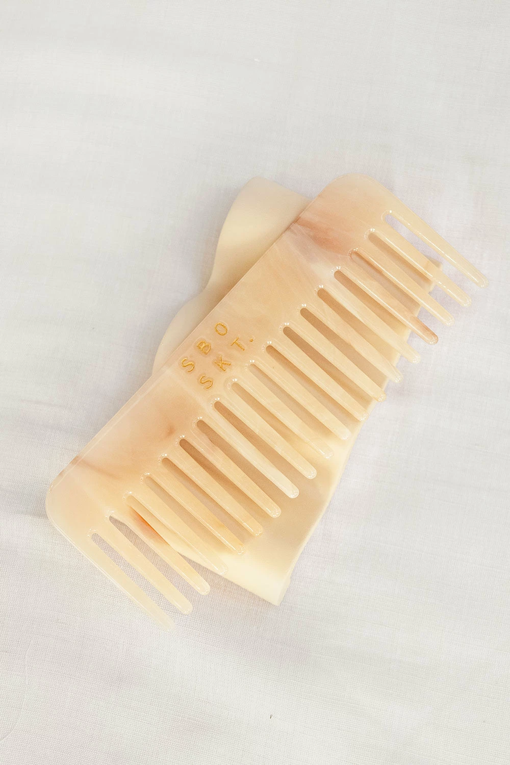 Super cute and travel friendly! The SBO SKT Comb features a cream marble shell finish with gold SBO SKT detailing. The perfect size to keep in your handbag for hair touch ups!