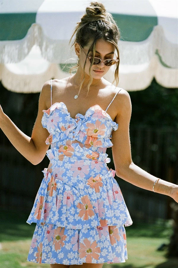 Step out in style with the Selma Cami Dress, made from a high quality natural linen cotton blend fabric with our exclusive Sky Floral print. It features thin straps, ruffle detailing across bust and waist, covered buttons at centre bodice, boning at waist and a double tiered frill skirt. Get the look with the Transparent Mules and Kumi Bag! Designed exclusively by Sabo.