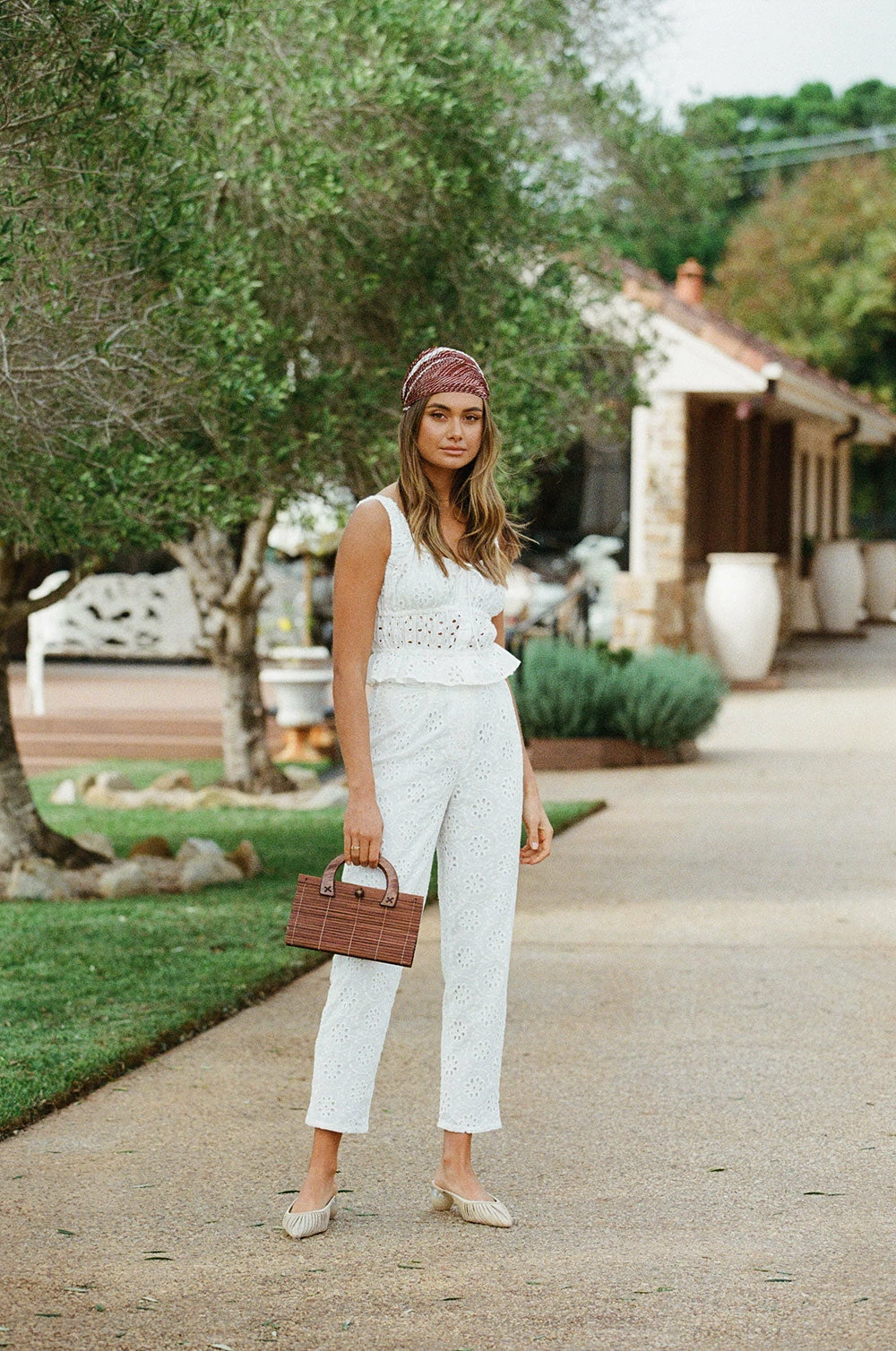 Trade your dress for a pant set with the Seraphina Eyelet Pants from our latest Sabo Luxe collection! They are made from a high quality natural cotton broiderie fabric in white. They are a high waisted style featuring ruffle detailing across waist, matching belt and tapered legs. Mix and match with the Seraphina Eyelet Top, Lucienne Eyelet Top or Mackenzie Eyelet Top! Designed exclusively by Sabo.