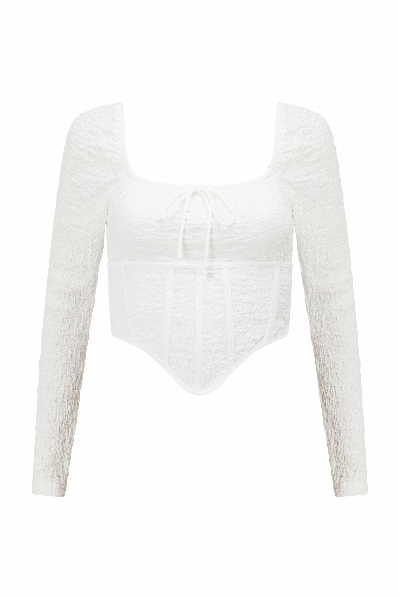 For our lovers of structured neutrals! The Shelton Top is made from a textured bubble fabric in white. It features full length sleeves, tie detail at neckline, boned corseted waist and curved hemline. Get the set and pair with the Shelton Midi Skirt and Strappy Rafaela Heels! Designed exclusively by Sabo.