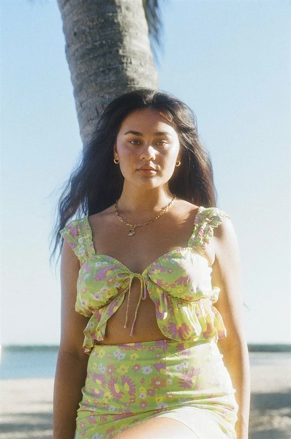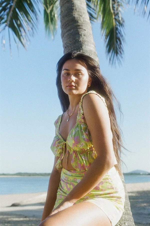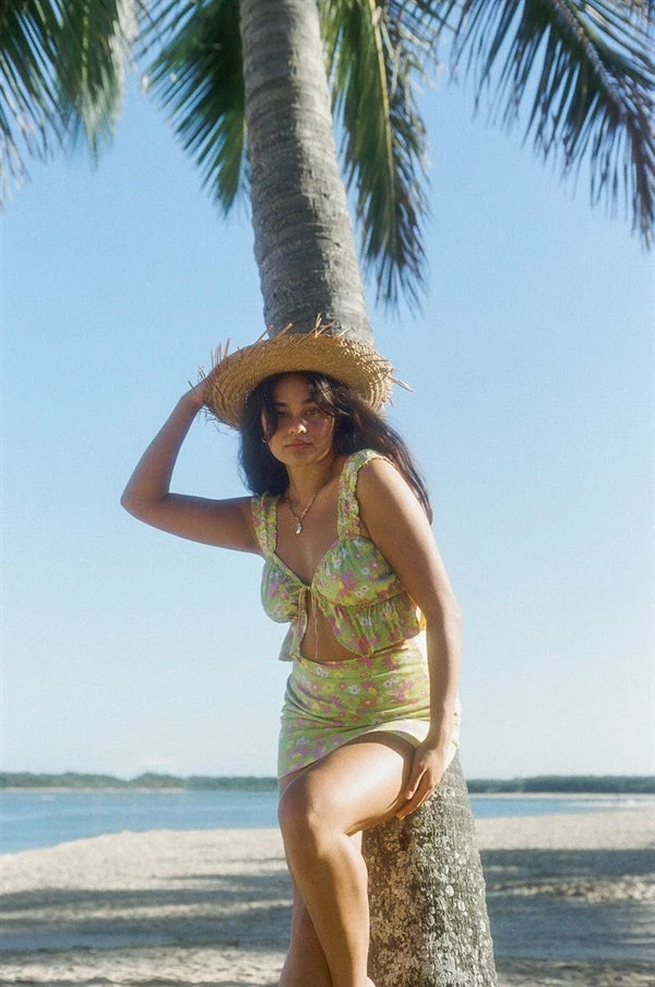 A super cute design with our exclusive new bright retro floral print! The Shev Top is made from a high quality viscose fabric and features a tie at centre bust, elasticated cap sleeves and an asymmetric frill detail across hem. Get the set and pair with the Shev Skirt or keep it casual with jeans! Designed exclusively by Sabo.