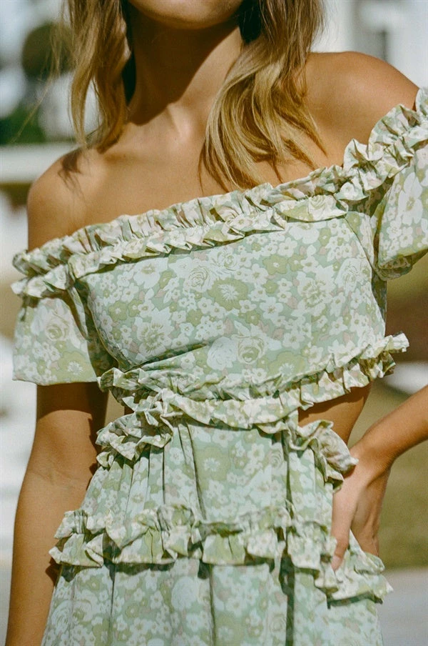 Ruffle panels and cutouts in all the right places! The Sienna Dress is made from a lightweight green chiffon-feel fabric with a floral print throughout. It is an off shoulder style featuring short puff sleeves, cutout at waist and ruffle trim detailing throughout. Complete the look with the Strappy Eva Heels and Lima Saddle Bag! Designed exclusively by Sabo.