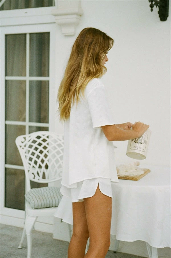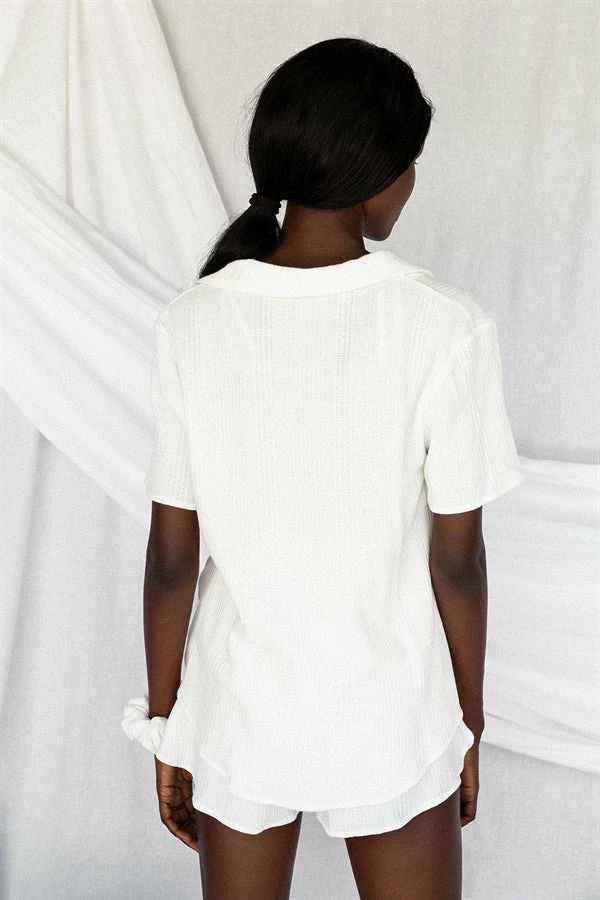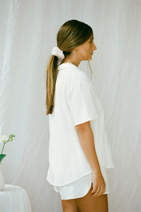 *THIS IS A FINAL SALE ITEM* Comfy and super cute! The Siesta PJ Top is made from a textured woven fabric in a light cream hue. It is a relaxed style featuring short sleeves, collar, pocket at left breast, curved hem and buttons down centre front. Pair with the Siesta PJ Shorts and Fluffy Slippers! Exclusively designed by Sabo.