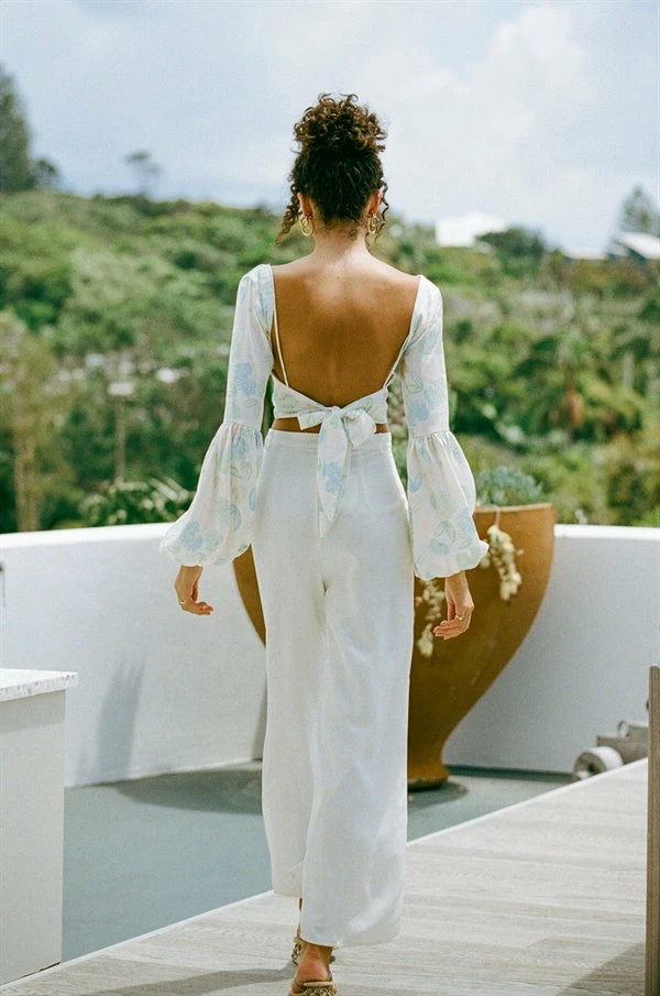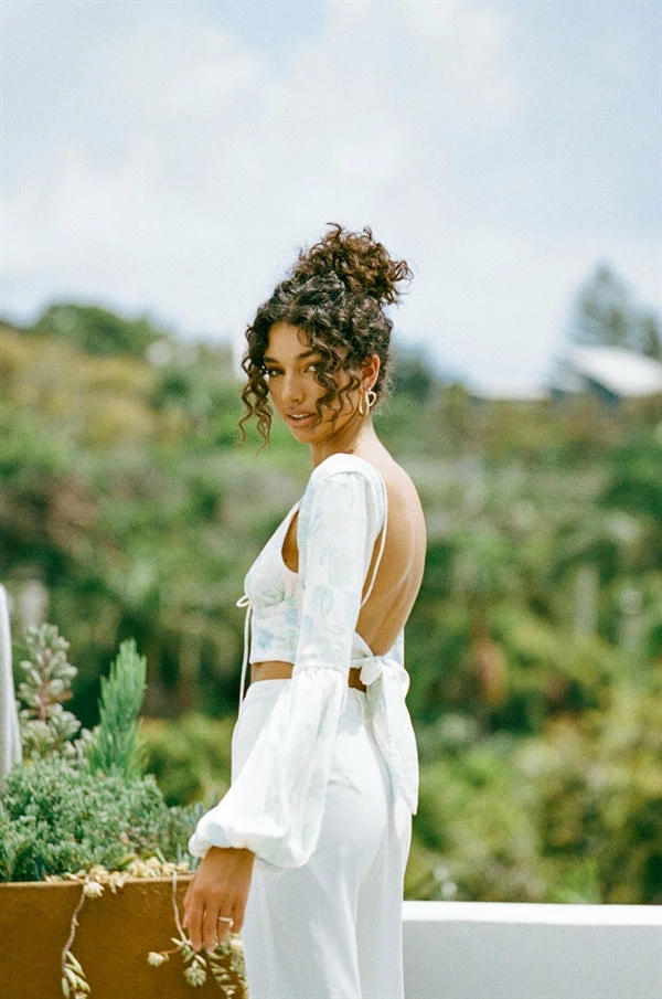 The dreamy Silky Sakari Top is made from a luxurious silky fabric with our exclusive garden floral print. It features dreamy puff sleeves, V neckline, thin straps and a drawstring tie at centre bust. Complete the look with the Kahlo Pants and Transparent Hoops! Designed exclusively by Sabo.