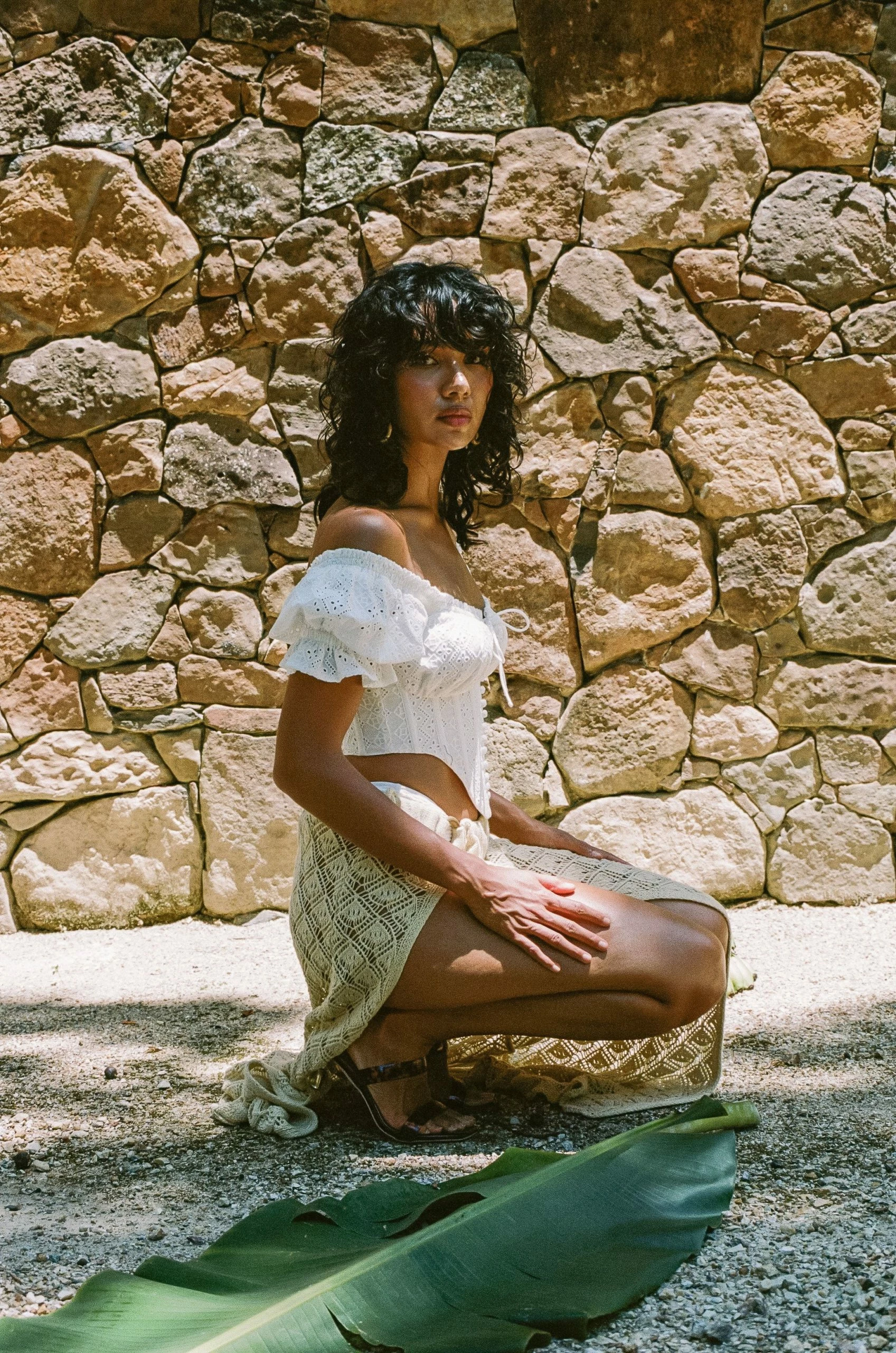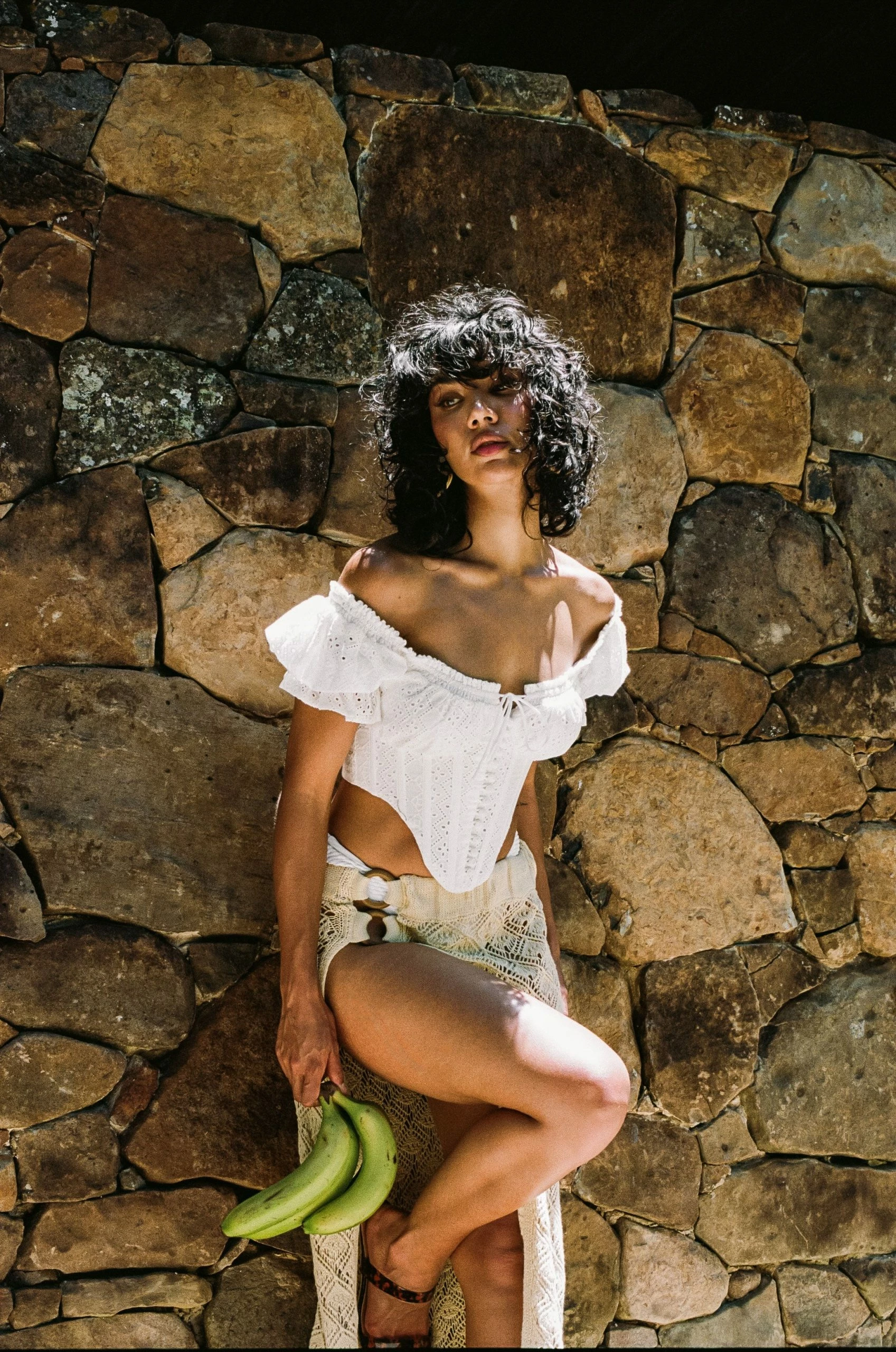Elevate your outfit with the SABO LUXE Stara Top! It is made from a high quality natural cotton broiderie fabric in white. It is an off shoulder style featuring short puff sleeves with frill hems, ruffle across neckline, tie at centre bust, covered buttons at centre front, boned corset waist and dramatic dipped hem. Style with wide leg pants and heels! Designed exclusively by Sabo.