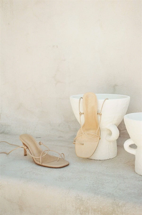 The Strappy Kenny Heels feature tan straps across foot, ankle ties and slim block heel. Exclusively designed by Sabo.