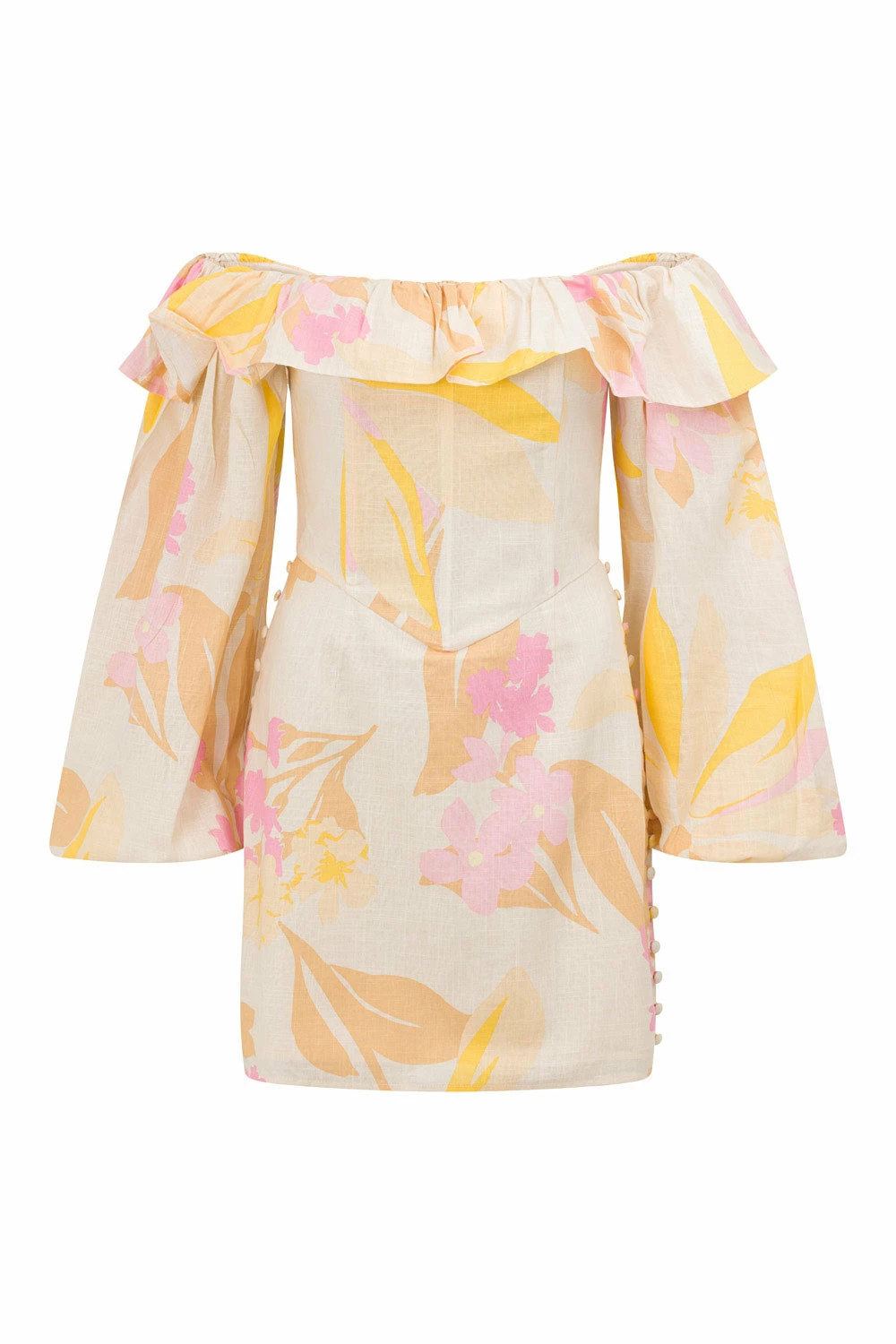 Perfect for party season, the Suza Off Shoulder Dress is made from a high quality natural cotton slub fabric with our exclusive midsummer vintage print. It is an off shoulder style featuring a frill across neckline, full length puff sleeves with a longline boned corset waist. Accessorise your look with the Strappy Leila Heels and Briella Earrings! Designed exclusively by Sabo.