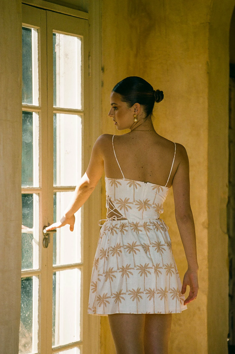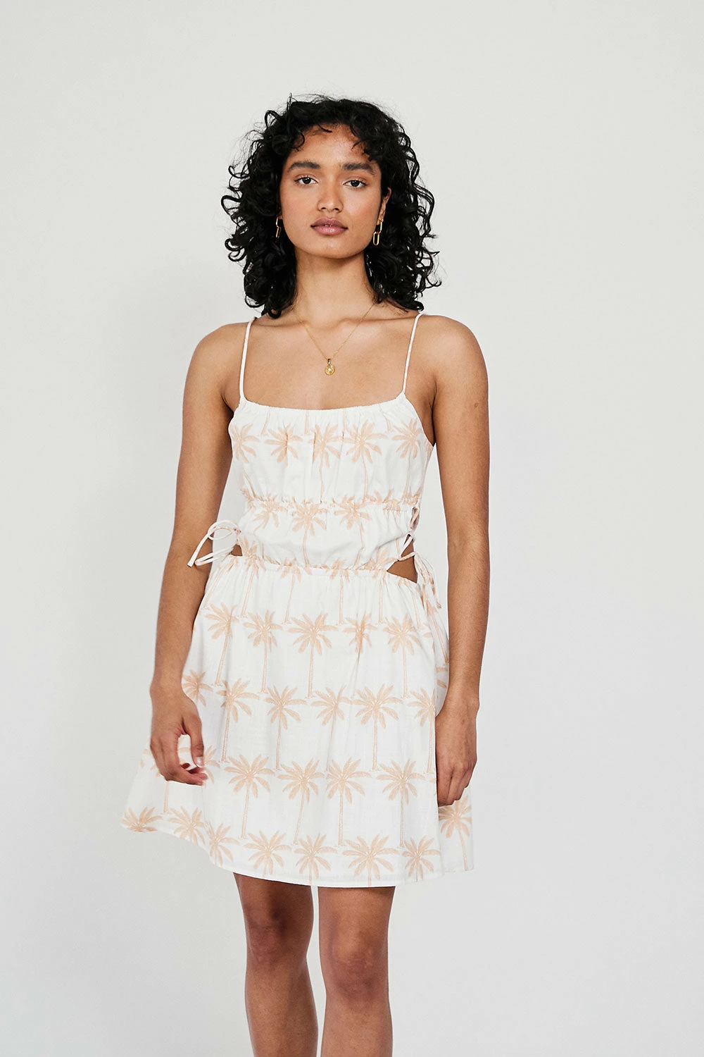 Our Reveries collection coming in hot! The Taj Dress is made from a high quality natural cotton fabric with our exclusive palm print. It features thin straps, elastic panels at neckline and waist, cutouts at waist with super cute tie details and a flouncy skirt. Designed exclusively by Sabo.