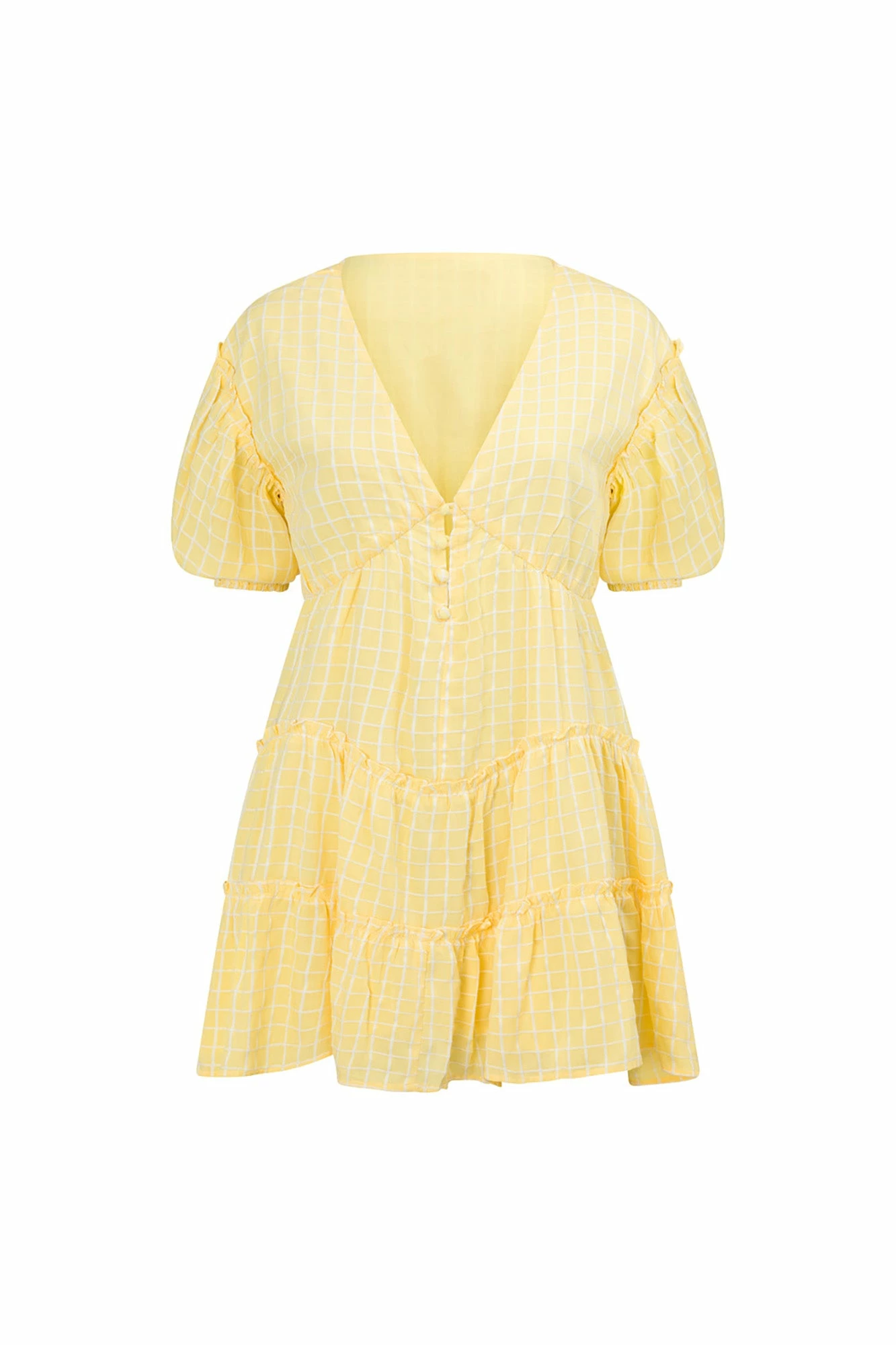 A super cute and easy-to-wear summer piece! The Tarelle Dress is made from a lightweight yellow fabric with textured white checks throughout. It is a relaxed style featuring a V neckline and covered buttons at waist, short puff sleeves, flouncy tiered skirt and raw exposed ruffle detailing throughout. Complete the look with sandals and sunnies! Designed exclusively by Sabo.