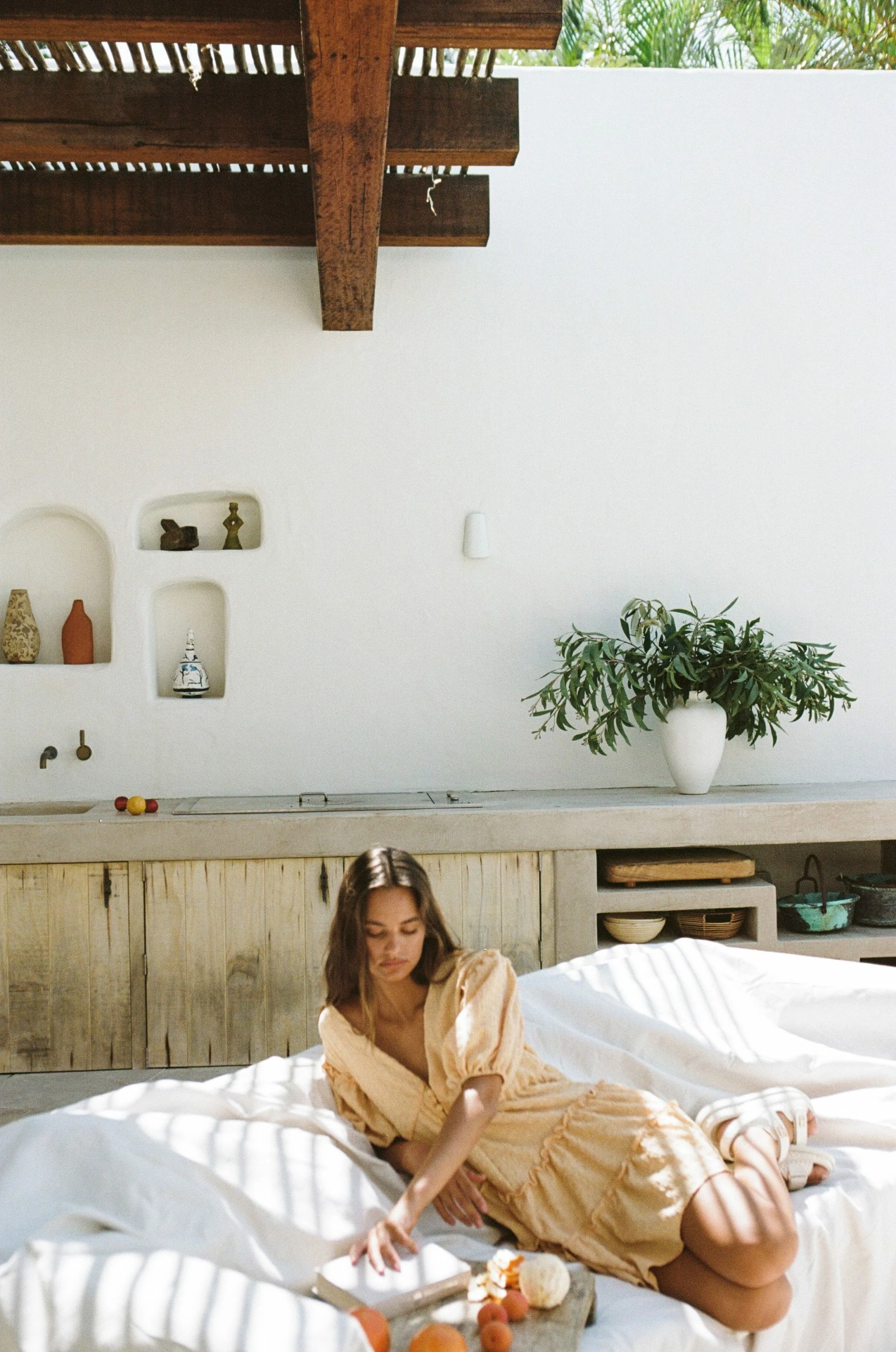 A super cute and easy-to-wear summer piece! The Tarelle Dress is made from a lightweight buttery orange fabric with textured self check detail throughout. It is a relaxed style featuring a V neckline and covered buttons at waist, short puff sleeves, flouncy tiered skirt and ruffle detailing throughout. Complete the look with sandals and sunnies! Designed exclusively by Sabo.
