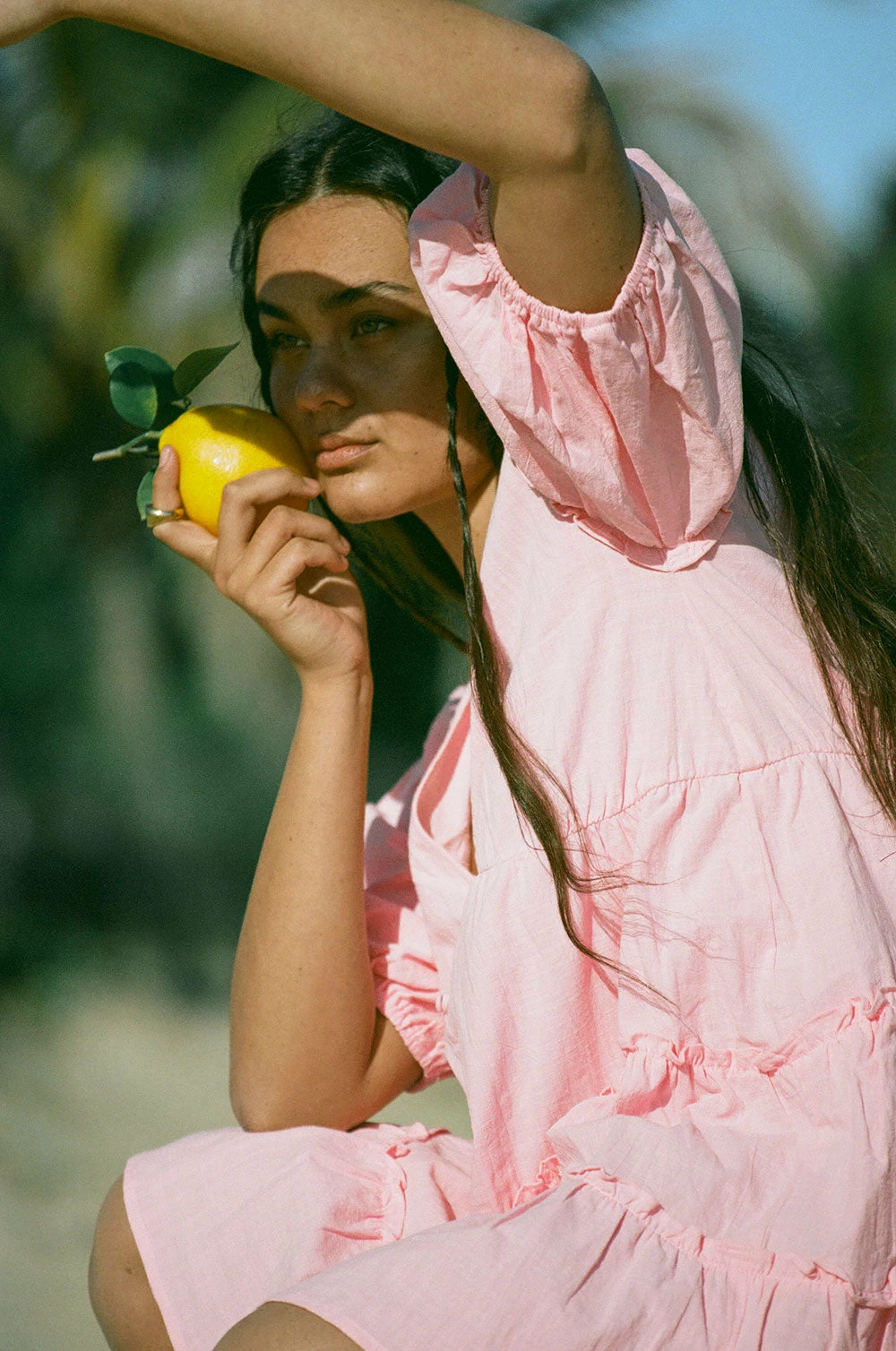Designed for the fashion-forward! The Tarelle Dress is made from a raw natural cotton fabric in pink. It is a relaxed style featuring a V neckline and covered buttons at waist, short puff sleeves, flouncy tiered skirt with raw exposed ruffle detailing. Complete the look with sandals and Rico Handle Bag! Designed exclusively by Sabo.