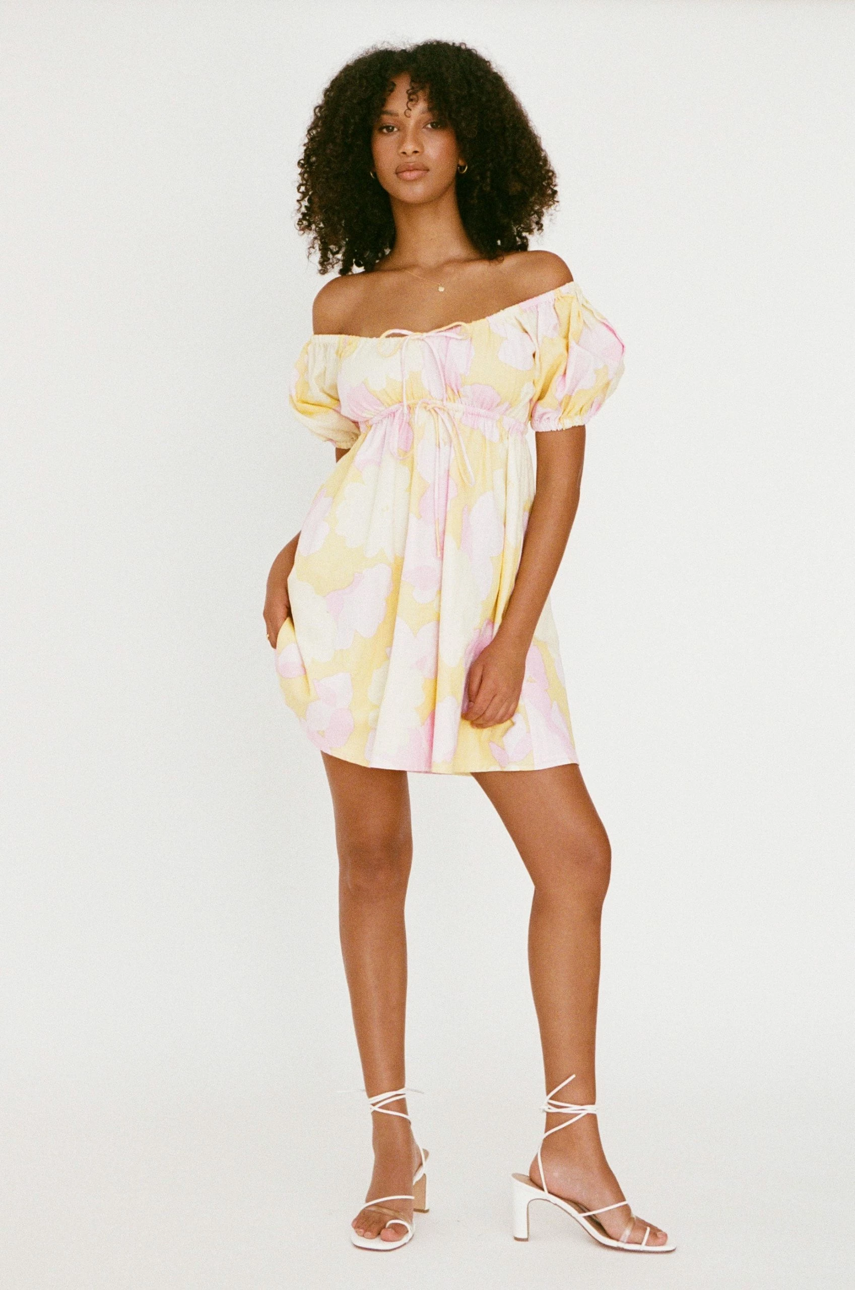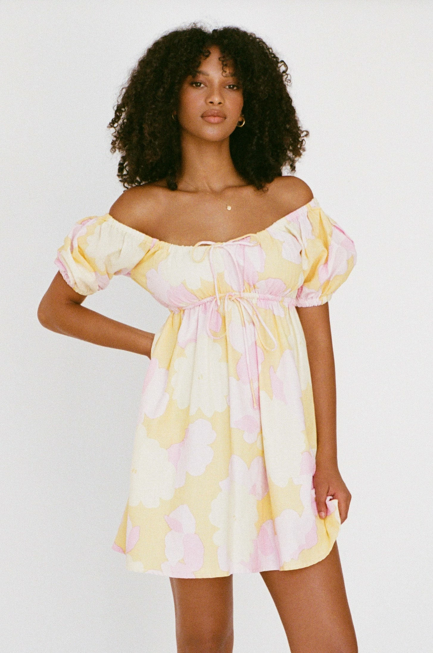 Pair it back with slides or dress it up with heels! The Tarlita Puff Dress is made from a high quality natural linen cotton blend fabric with our exclusive flutter print. It features short puff sleeves, draw ties at centre bust and waist and a flouncy babydoll skirt. Designed exclusively by Sabo.
