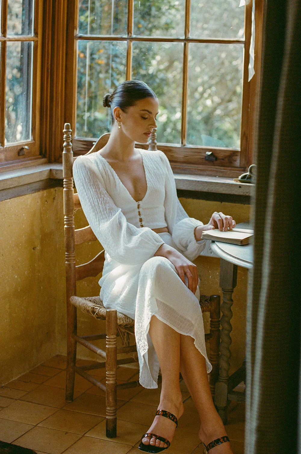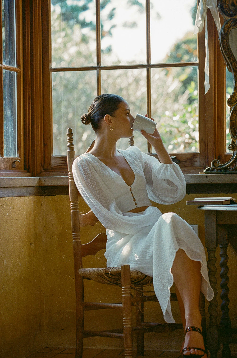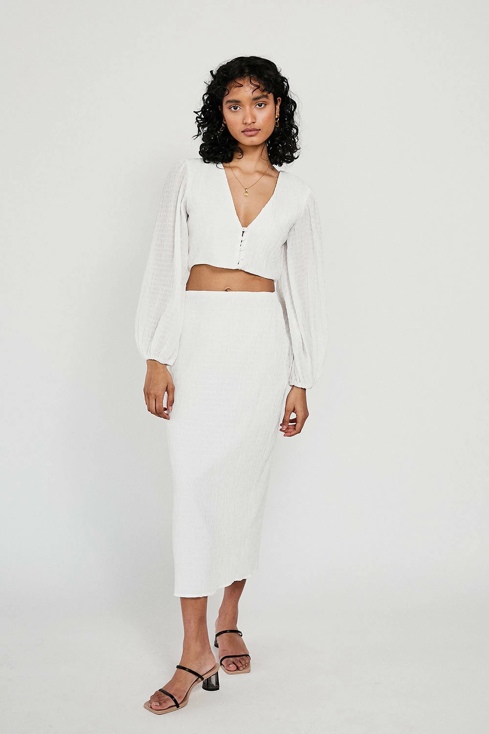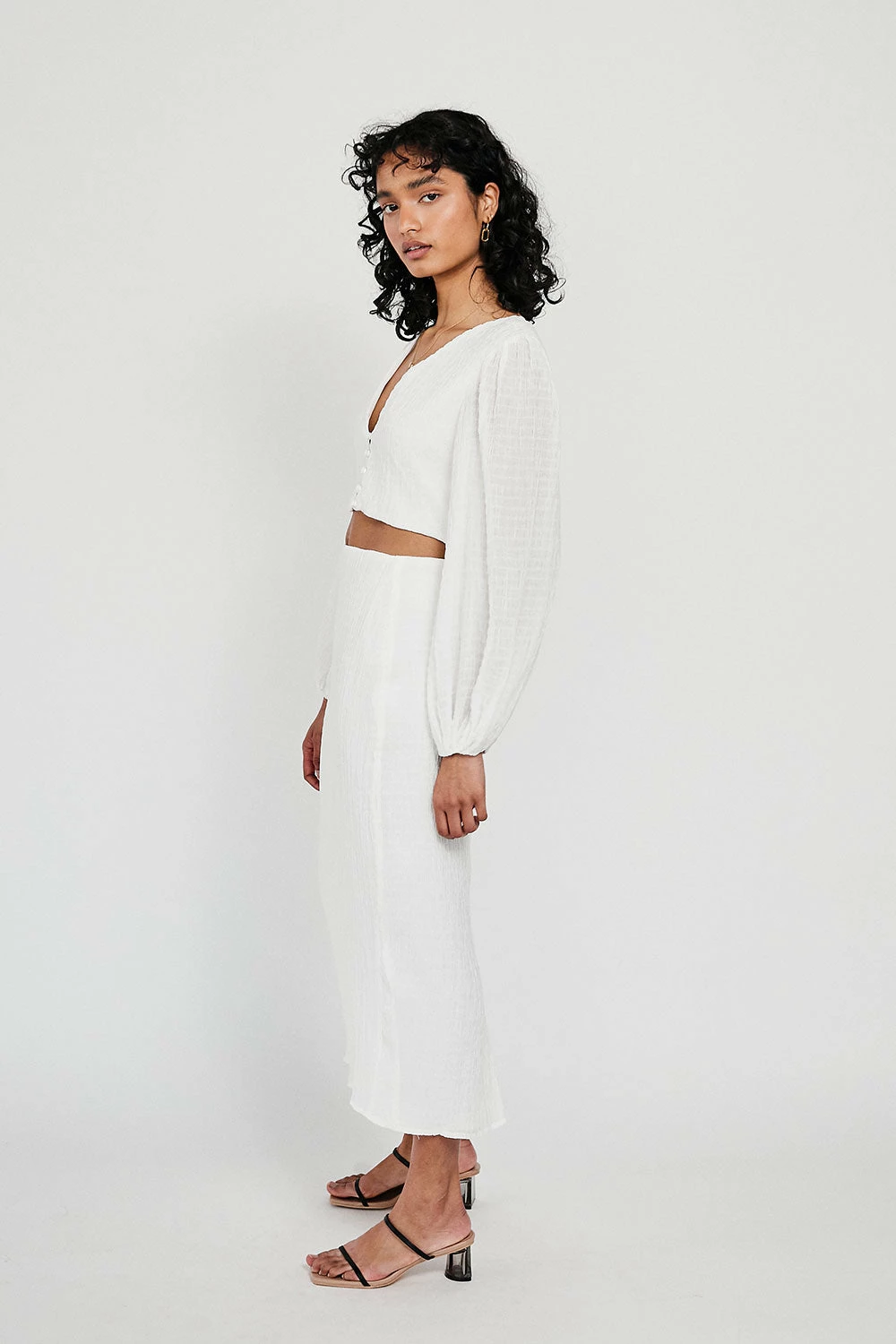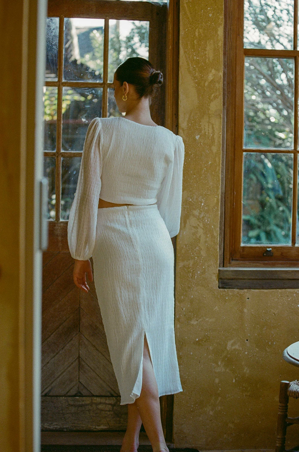 Dress it up and wear it as a set or style it your way! The Tasmin Skirt is made from a textured crepe fabric in off white. It is a high waisted midi style featuring a split at centre back. Pair with the Tasmin Top! Designed exclusively by Sabo.